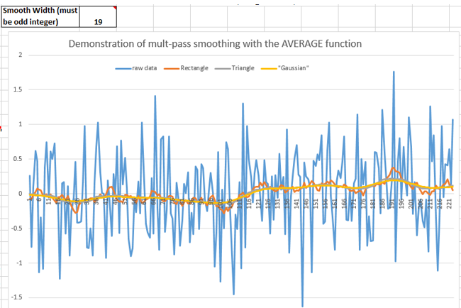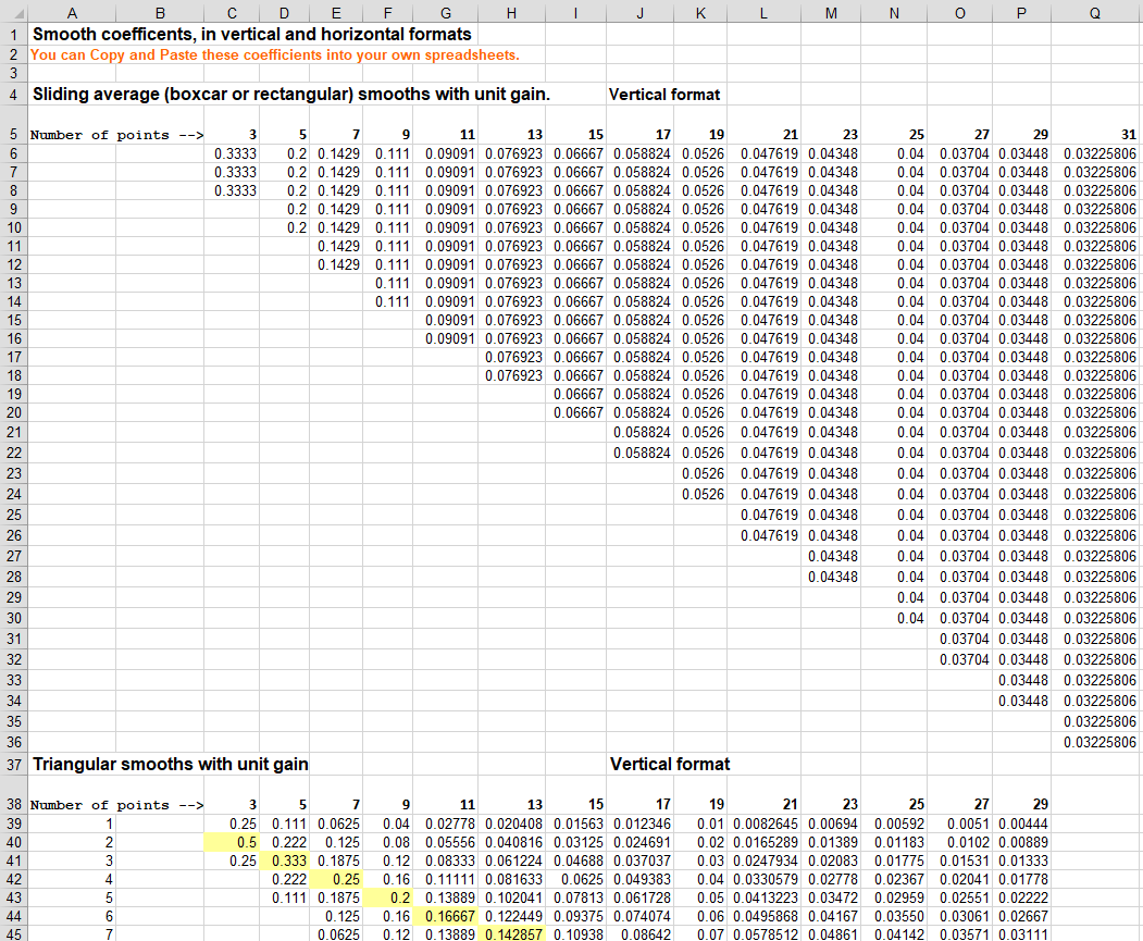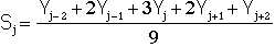 The triangular smooth is like the rectangular smooth, above, except that it implements a weighted smoothing function. For a 5-point smooth (m = 5):
