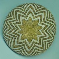 The Mbunda-Luvale and Luchazi of Western Zambia and Angola, made baskets from the roots of the mukenge tree, which enhanced the longevity of the object. This is a large cassava flour root basket used to catch and hold cassava flour. The small nipple at the centre is a centuries-old addition intended to add durability to the basket by spreading away any build-up of cassava meal from the point most apt to rot. Mukenge root was carved down to a desired thickness in long lengths, then soaked in water for a month before weaving. The use of mukenge hard root extended an article’s life. Ezakwantu.com |