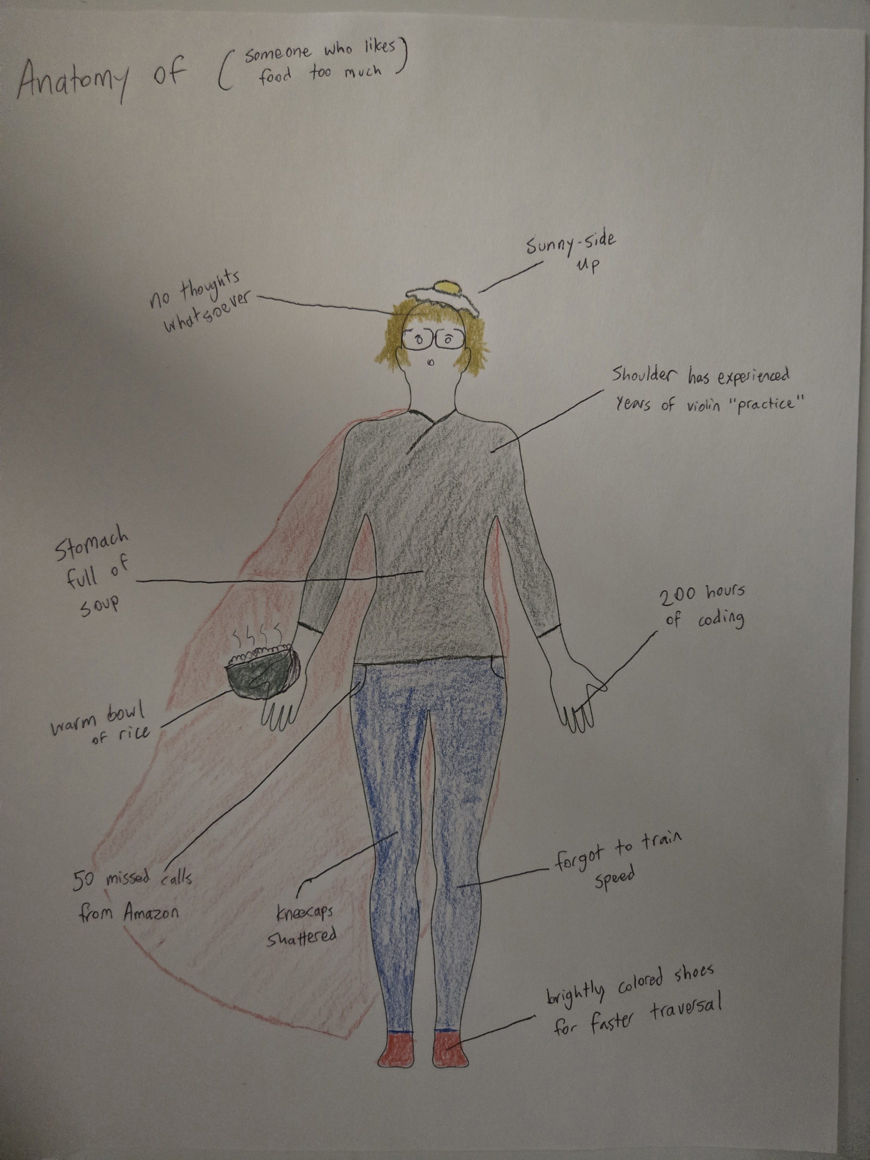 At the next station, there was an option to either fill out a pie chart with our emotions, or design a blank human body. I chose the latter, and decided to be a little silly. An option was to address how we felt about climate change using either medium, but I diverted from that somewhat, and just drew what came to mind in the moment, as seen below.