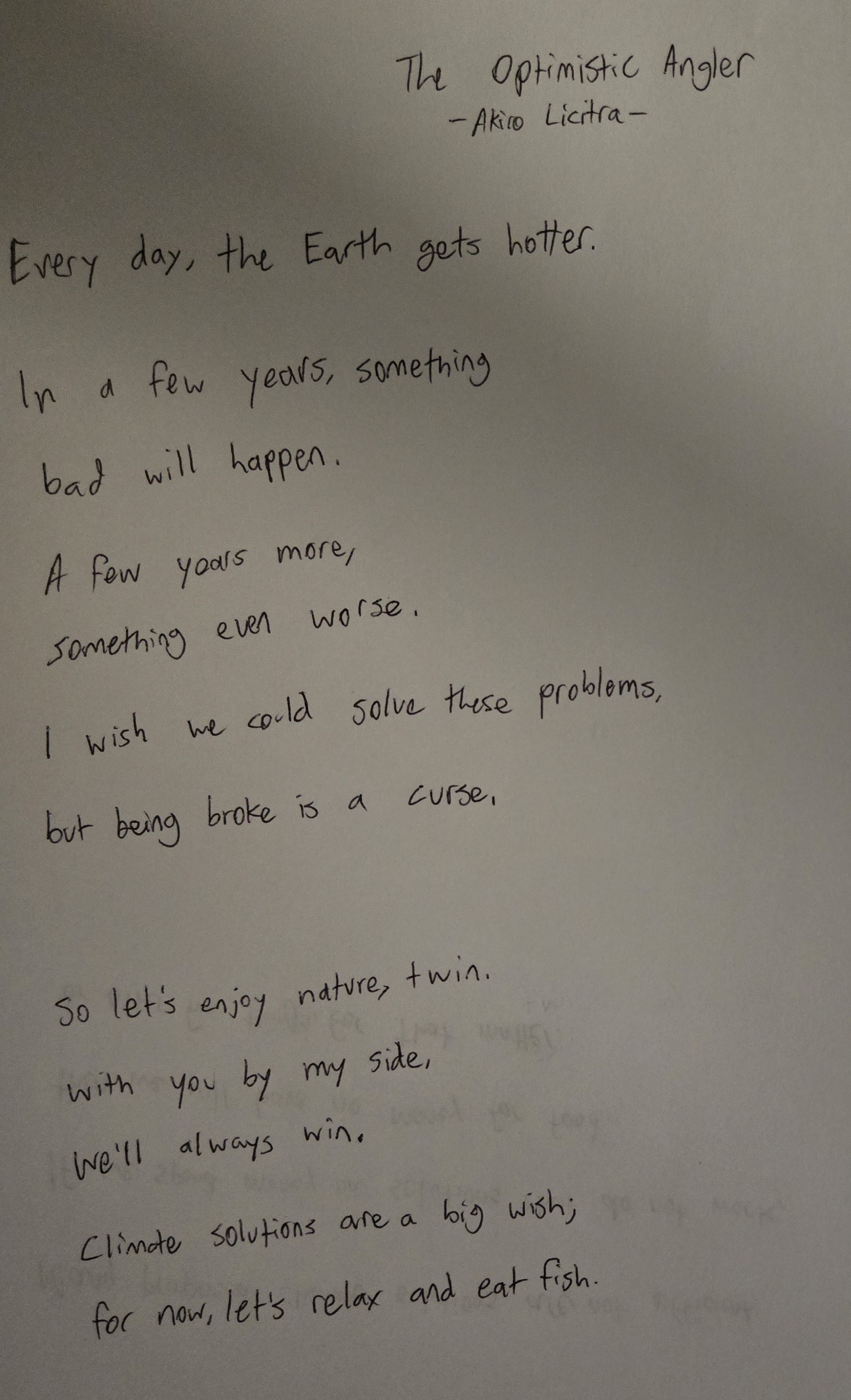 The last station I visited gave us a choice between making a zine or writing a poem. We were given the opportunity to research a climate issue of our choice and then report on it in a creative way. I decided to reflect off the experiences from the CPSG200 Colloquium and possible climate solutions when writing the poem below. It is meant to be a humorous take on sort of rejecting any pessimism, even in the face of real issues.