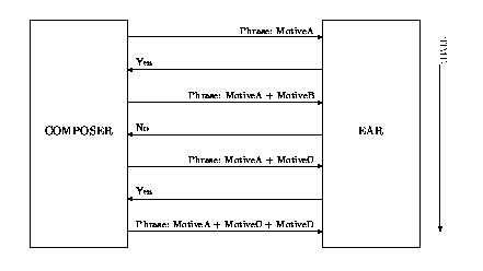 Figure 1 illustrates the process. The composer takes as input a number of melodies, and composes a phrase from them motive by motive. The composer creates music by producing a variation on a previous motive and layering and sequencing it with the other motives. Each motive is either a copy of a primary motive, a variation upon a primary motive, a copy of a previous motive, or a variation upon a previous motive. At each step, the resultant phrase is tested by the ear and given a yes/no grade. If the ear likes the piece, the composition process continues. If the ear does not like the piece, the composer deletes the motive and tries a different variation.