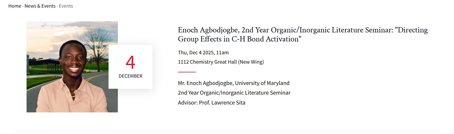 Name of Presenter/Organizer: Enoch Agbodjogbe, 2nd year Grad student under Professor Lawrence Sita and the Sita Laboratory team. Title of Presentation/Talk/Event: "Directing Group Effects in C-H Bond Activation" Date and Location of Presentation/Talk/Event: 11am on December 4th, 2025 in the large conference room (1112) in the Chemistry building's New Wing.