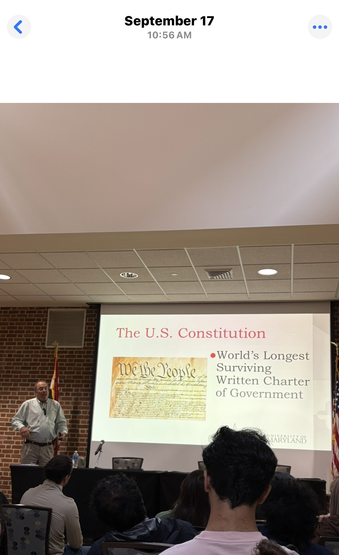 Dr. Michael Ross is a history professor at UMD with research expertise in the 19th century, Constitutional history, and the United States. His job as the presenter was to discuss the body of the Constitution, from the Preamble through Articles one through seven. Even though I had to leave early, I think the main point of the whole presentation was to discuss how the Constitution impacted our nation at the time of its creation and why it matters to this day. As college students, we are learning how to become independent adults in society with the right to vote, and many of our viewpoints are being shaped during this time. This means that it is important that we are not ignorant to the contents of the Constitution because they have laid the foundation of our country's government that is constantly changing.