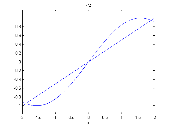 syms x; ezplot(sin(x),[-2,2]); hold on; ezplot(x/2,[-2,2]); hold off