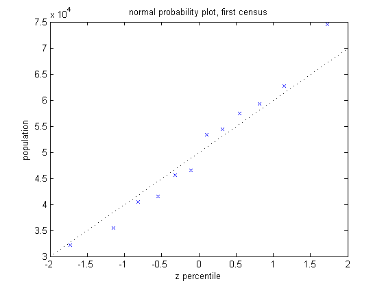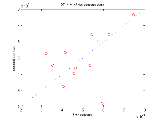 One could try the same thing with the second census, but more interesting is the 2-dimensional plot of the first census versus the second census. In this picture, the dotted diagonal line would correspond to the population not changing between counts.