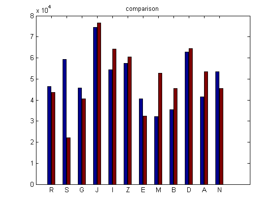 Here is a bar graph showing both censuses: the first census on the left of each pair in blue and the second census to its right in red. The labels along the bottom refer to the names of the tribes: R = Reuben, S = Simeon, G = Gad, J = Judah, I = Issachar, Z = Zebulun, E = Ephraim, M = Manasseh, B = Benjamin, D = Dan, A = Asher, N = Naphtali.
