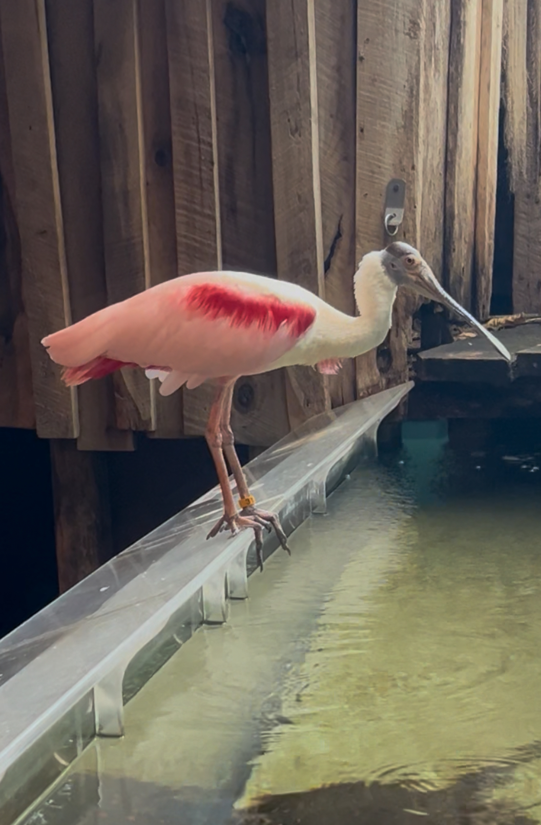 At the Amazonia, we saw corals, Panamanian golden frogs, aquatic caecilian, and the roseate spoonbill. We learned that the coral reefs are currently threated by rising water temperatures and ocean acidification, which is linked to rising carbon dioxide levels. High water temperatures cuse corals to lose the algae that produce the food corals need, which gives way to the condition known as coral bleaching. Coral reefs rival rainforests in diversity of life, and they hold the most diverse ecosystems on the planet together. We also saw the Panamanian golden frogs, which were referred to by The Sixth Extinction: An Unnatural History, by Elizabeth Kolbert. These frogs are native to the rainforests and cloud forests of Pananama, but have been driven to extinction in the wild by chytridiomycosis, a disease caused by a fungal pathogen called the amphibian chytrid fungus. Another specimen that drew our attention was the aquatic caecilians, also known as rubber eels, which are found in Colombian and Venezuelan lowland rivers and streams. They're the third type of amphibians, other than frogs and salamanders, and can grow up to 22 inches in length. Finally, we spotted roseate spoonbills wandering around the edges of the exhibit. They're large wading birds with pink pumage and a distinctive spoon-shaped bill. They can be found in southern Florida, coastal Texas, and southwestern Louisiana. They also breed in regions from Florida to Argentina, Chile, and Uruguay. This time, there were screens around the exhibit that showed detailed depictions of the skeletal structure of the species that were on display, which were interesting to look at to see how these animals are classified and the similarities between them. I think the education level is still largely targeted towards audiences of all ages and education levels, though it does seem a little more technical than the Bird House exhibit. Visitors paid more attention to the information plaques, since some of the species were harder to spot and required a closer look at the detailed description of their physical appearance in order to spot them in the display.