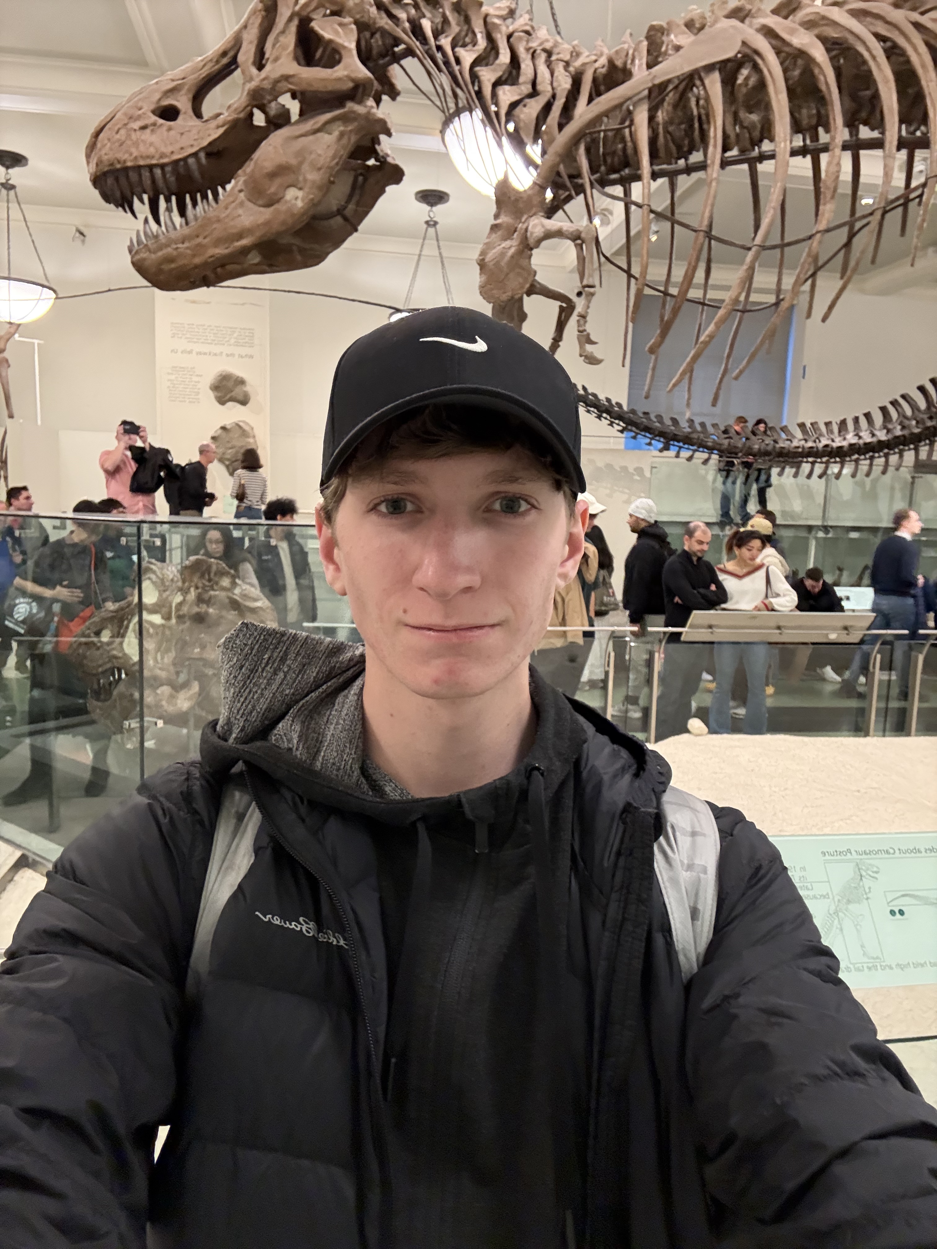 Nathaniel Folliot in front of the T.Rex Skeleton