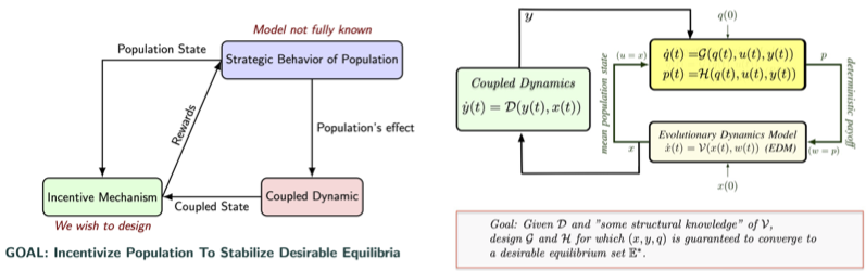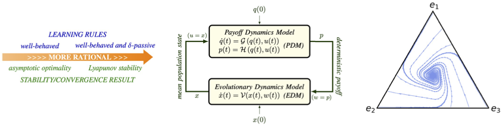 Professor Nuno C. Martins' research uses system-theoretic passivity methods to ensure stable learning dynamics in large population games involving strategic, non-cooperative interactions. By modeling the population's learning dynamics and payoff feedback as a closed-loop system, these frameworks guarantee convergence to Nash equilibria without requiring precise knowledge of individual learning rules. Martins and colleagues introduce new passivity notions (e.g., delta-passivity, equilibrium-independent passivity, and counterclockwise (CCW) dissipativity) that generalize classical input-output characterizations of rational behavior. This approach unifies earlier results (e.g., potential games) and expands stability guarantees to broader scenarios, including dynamic payoff processes and imitation-driven dynamics like replicator rules. Their passivity-based analysis provides robust convergence assurances for evolutionary Nash equilibrium learning across diverse population games.