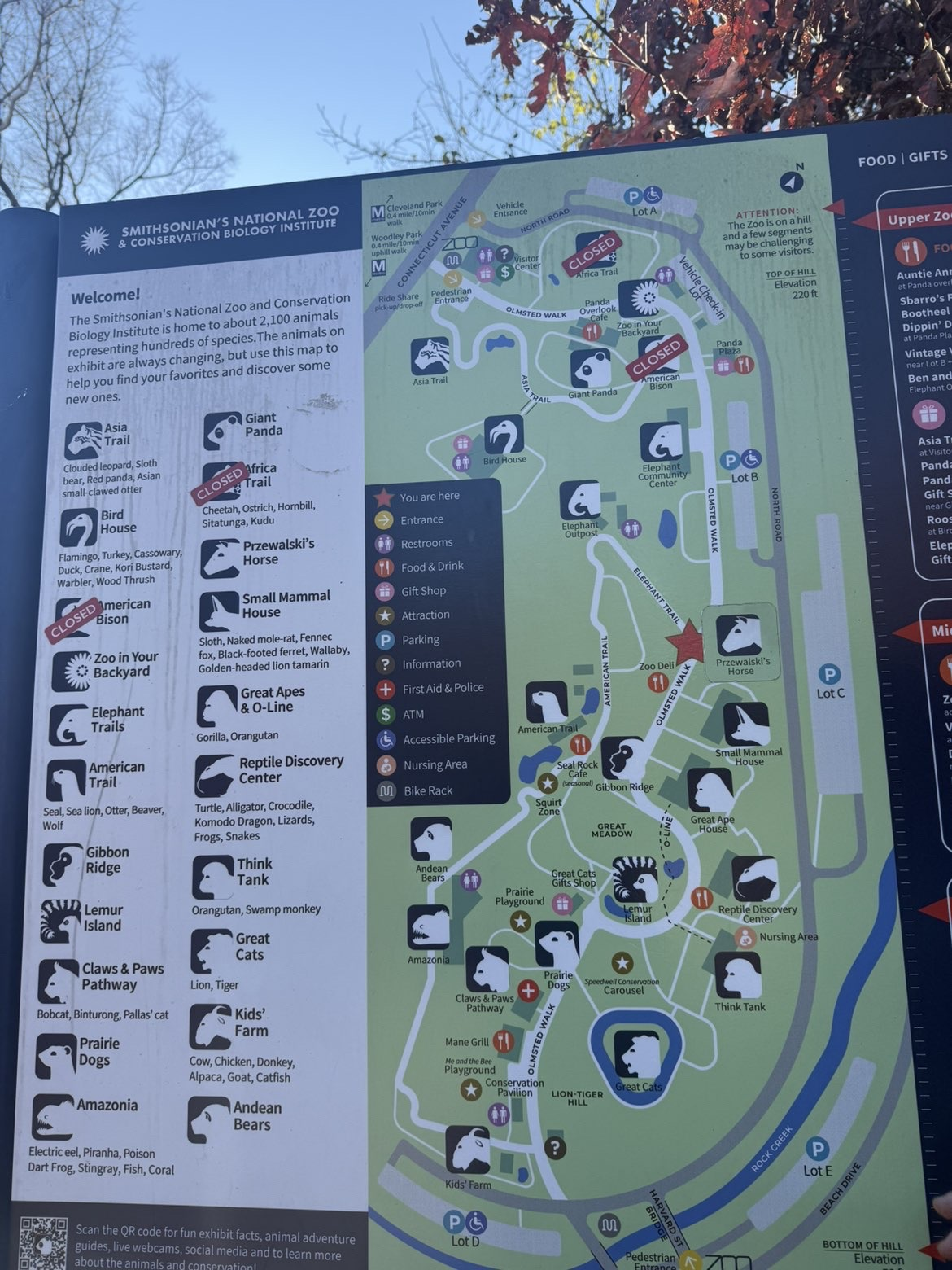 This brings me to my next point, which is that the National Zoo is free to enter. I understand that not all Zoos are like this, but they should be. The animals should not be considered a show, with a ticket to buy like it’s the circus. Having free entry makes the Zoo feel like a learning environment, instead of an exploitative gimmick. I understand that the optics aren’t great, with animals restrained in range and natural predation, but I think the National Zoo offers far more than this. If you take away the optics, you see a truly beautiful environment of learning for individuals of all ages, while also serving as a center of conservation for some of the most loved but at-risk species on the planet. I thoroughly enjoyed my experience learning about the different animals and ecosystems the Zoo had to offer, and I hope other people visit to enjoy the same experience I had.