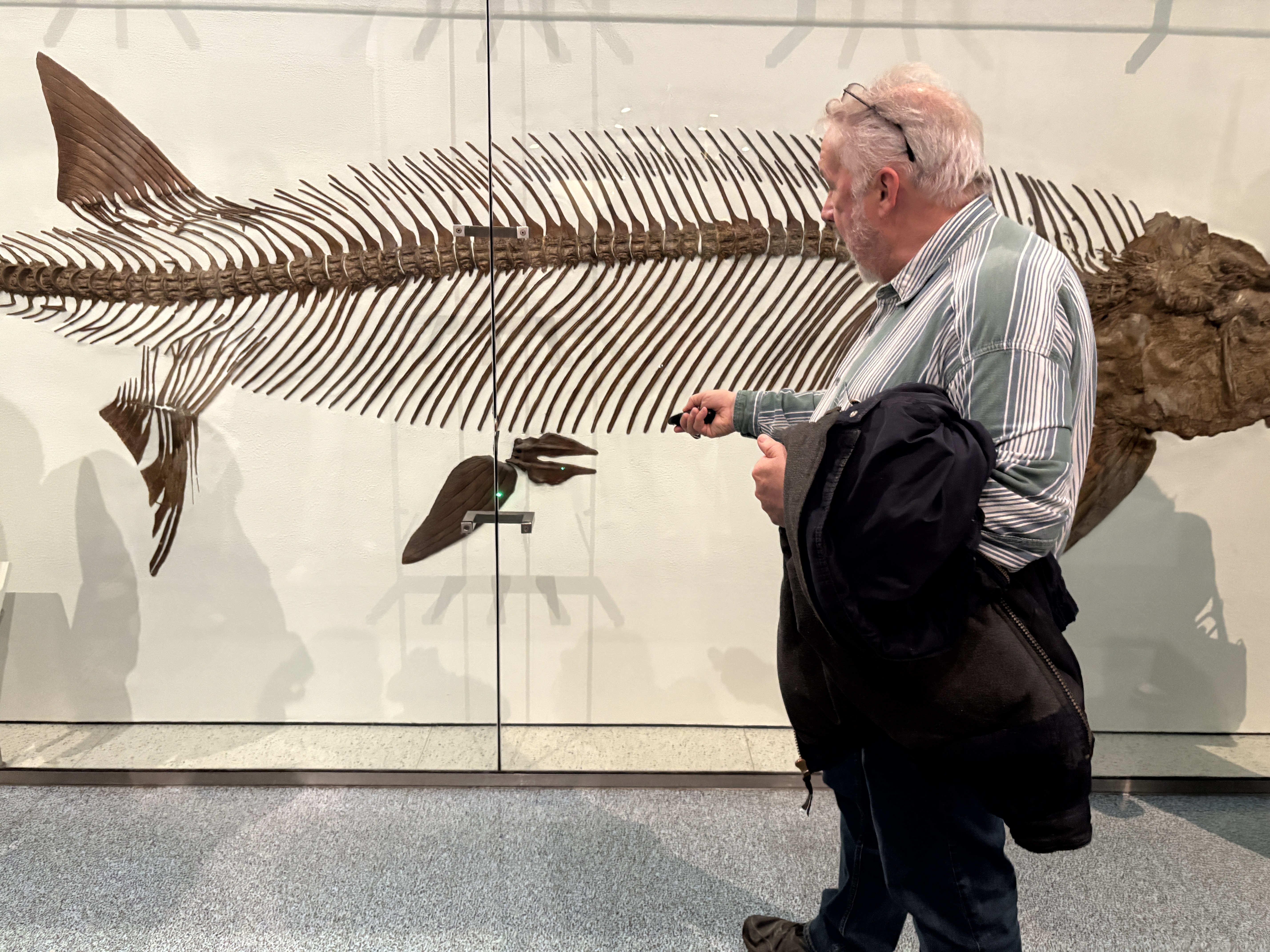 In the Collections Core with Dr. Merck at the Hall of Vertebrate Origins, I saw a fossil of a Sauripteris fin that was displayed next to an image showing a clearer view of the bone structure. This helped show how aquatic vertebrates eventually evolved into land animals. I also saw what I believe was a fossil of a Stenopterygius quadriscissus, which was placed behind a glass pane. This fossil showed the animal in the middle of giving birth, along with the young it was delivering. It demonstrated how some aquatic animals evolved to carry their eggs inside their bodies because their eggs were not waterproof. At the end of the tour, we learned about Pterosaurs and how one of their fingers was actually the long support for the wing tissue. We also talked about how their chest bones were not very flexible because their bodies were structured to carry most of their weight on the upper half. Natural history specimens like these are useful because they help us understand how animals evolved and adapted.