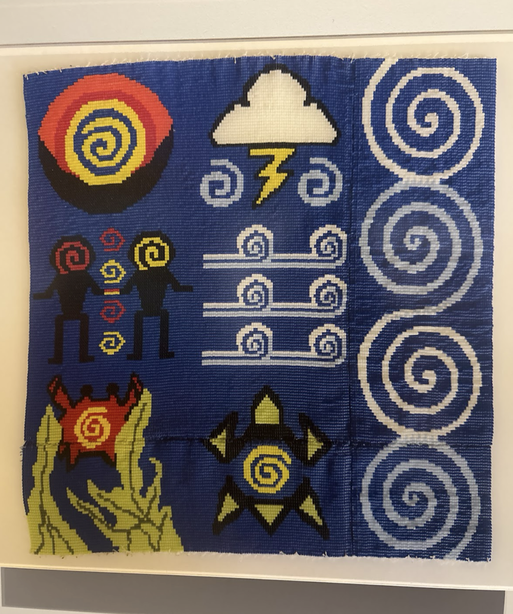 Within the hall was a gallery with art created by artists' reflection on climate change. One of the most notable to me was titled "The 7 Rs" and was created by Lara A. Jacobs, Coral Avery, Kathryn Champagne, Rhode Grayson in Oregon in 2022 using beadwork. The piece shows the seven Rs of the indigenous value system: respect, relevancy , reciprocity, responsibility, rights, reconciliation through redistribution, and relationships. The artwork was meant to stress the importance of centering indigenous voices in sustainable practices to reduce harm on marine systems.