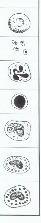 9. Examine the smears. Most of what you will see are red blood cells, but don’t count these. Count as many white blood cells as you can categorized as indicated on the cartoon, with about 100 giving a good differential count. Record the number and percent of :
