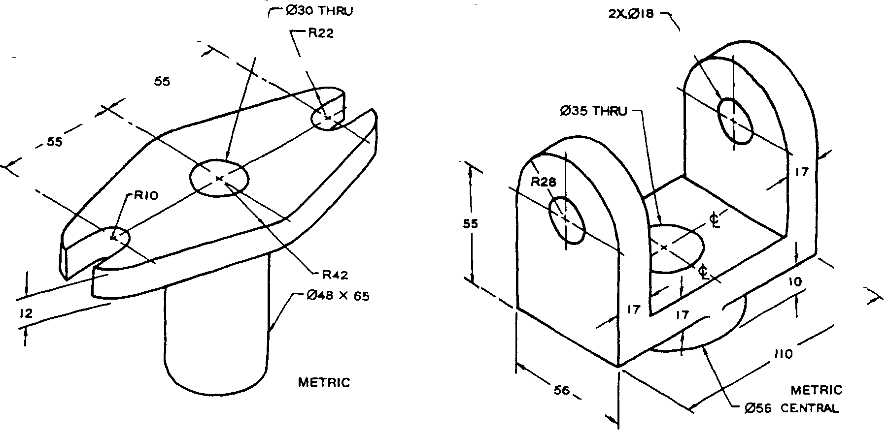 Problem 1: Two objects are given in the format of three-dimensional drawings. The students are asked to make two-dimensional drawings. As a minimum requirement, the top, front, and right-sided views are required. You are not asked to use computer software tools. Using a pencil and a ruler would be sufficient to complete this assignment. It is recommended that you pay attention to: