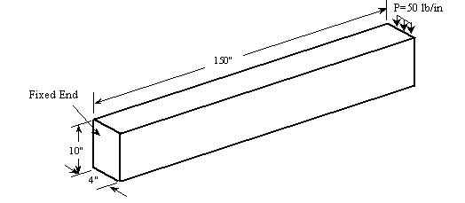 A cantilever beam created in Pro/ENGINEER is illustrated in figure 1. The material used here is AL2014_IPS. It is the same as that in the example used for the training session. Therefore, you can retrieve the material information from the material library of Pro/MECHANICA. The original dimension of the beam is 150" x 10" x 4". The load acting on the free end is a uniformly distributed load. Its magnitude is P= 50 lb/inch, acting on the central part of the end edge and covering a length of 2". Note that the loading condition remains unchanged during the process of varying the beam thickness. This assignment requires