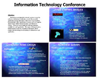 The purpose of the Information Technologies Conference is to provide information to students on the availability of engineering software packages throughout the College of Engineering. In addition, the conference gives students and faculty insight and demonstration of some software packages such as EES, Pro/Engineering, ANSYS, and MatLab. This will allow listeners to find out more about the potential of the software presented at the conference. Since this project is part of the ENME414 class, a more elaborate presentation of ANSYS, Pro/Engineering and Pro Fly Through will take place.