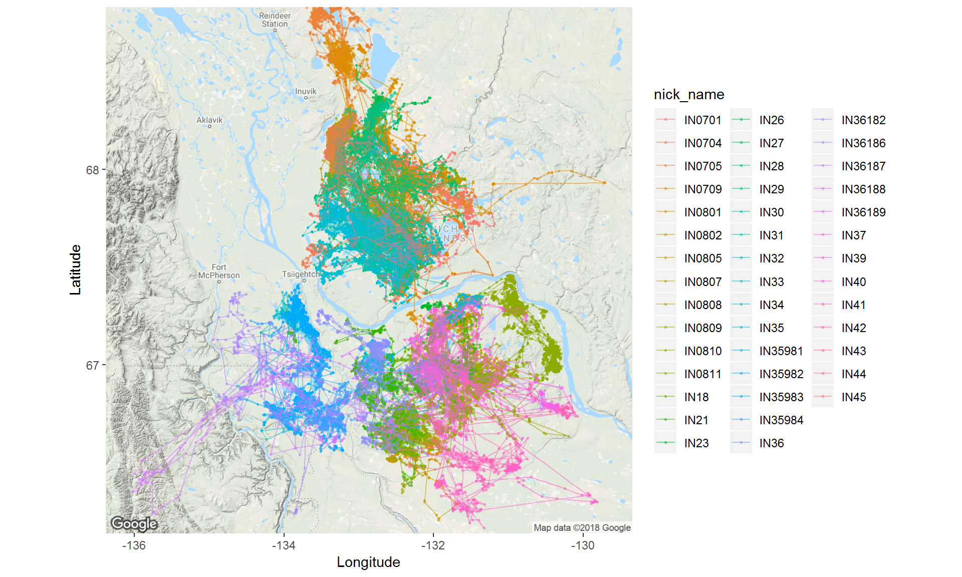 geom_path(data = inuvik.df, mapping = aes(x = location_long, y = location_lat, col = nick_name), alpha = 0.5, size = 0.5) +