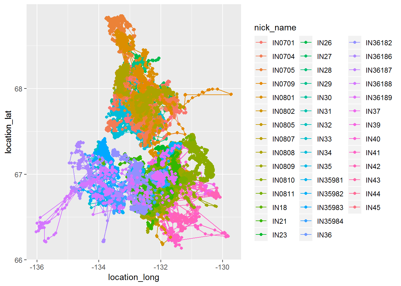 ggplot(inuvik.df, aes(location_long, location_lat, col = nick_name)) + geom_path() + geom_point()