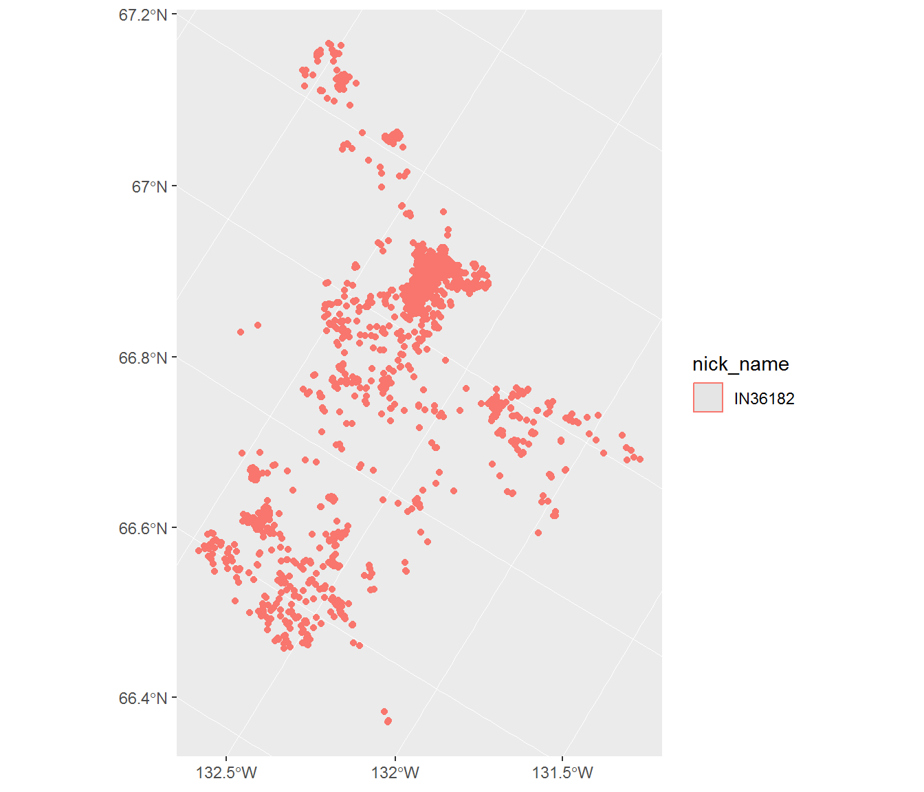 geom_point(data = inuvik.df, mapping = aes(x = location_long, y = location_lat, col = nick_name), alpha = 0.5, size = 0.5) +