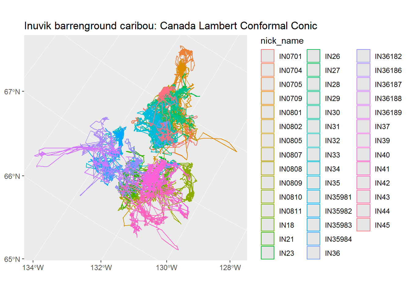 ggplot(inuvik.line %>% st_transform(102002), aes(col = nick_name)) + geom_sf() + ggtitle("Inuvik barrenground caribou: Canada Lambert Conformal Conic")