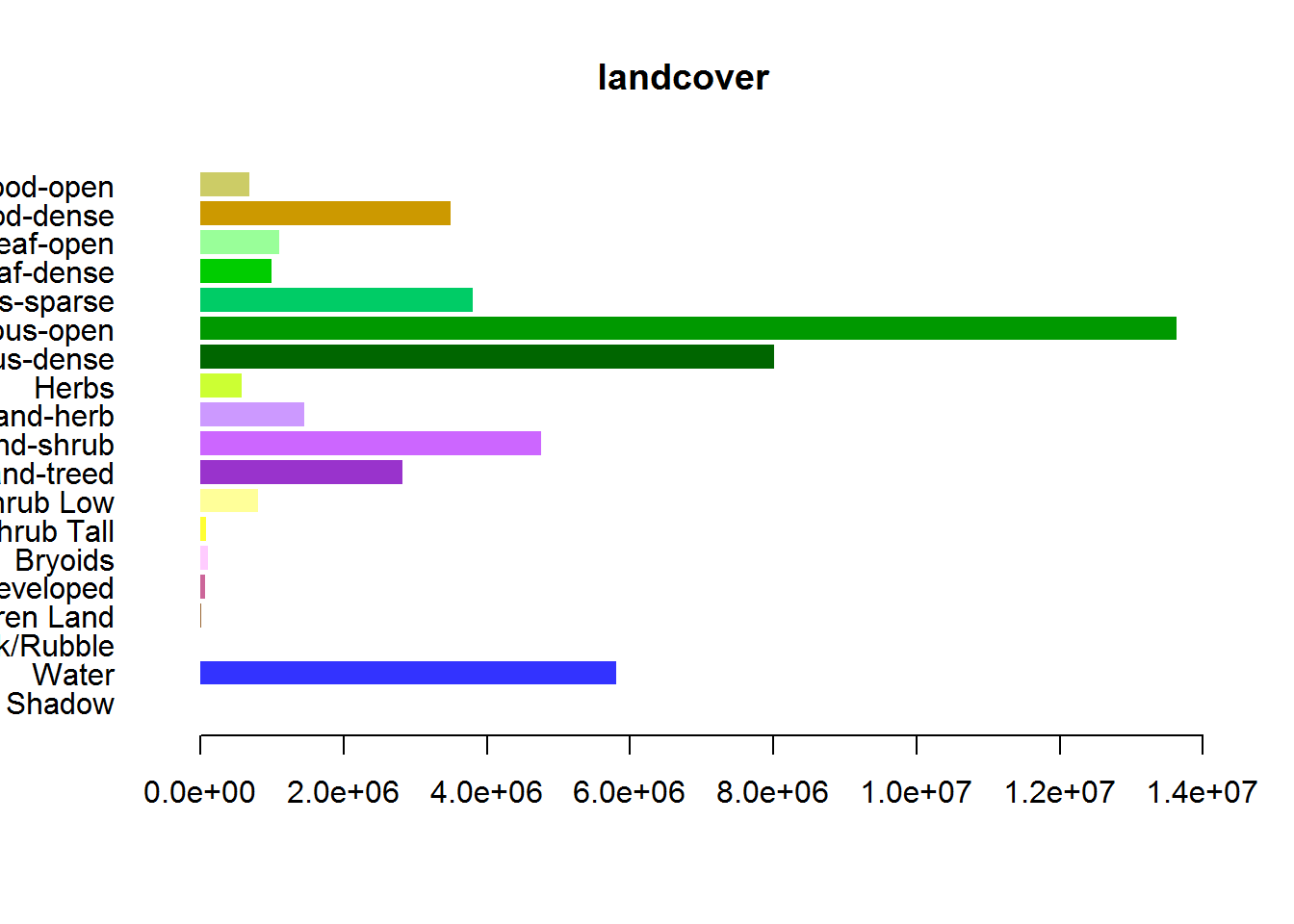 horiz = TRUE, las = 1, bor = NA, names.arg = newlevels$Description, main = "landcover")