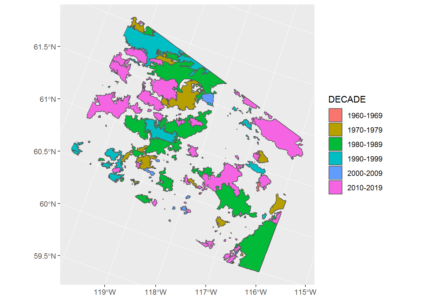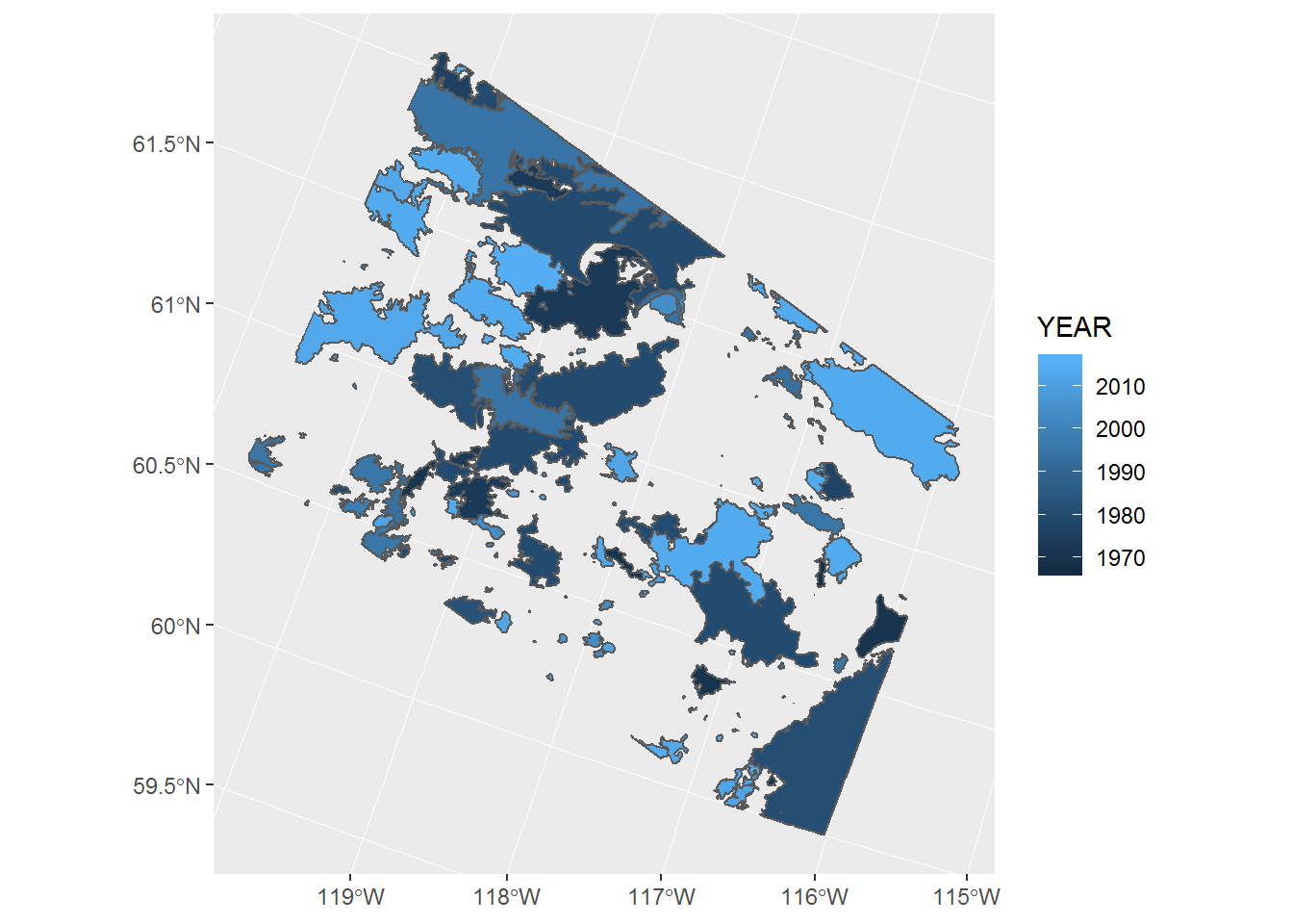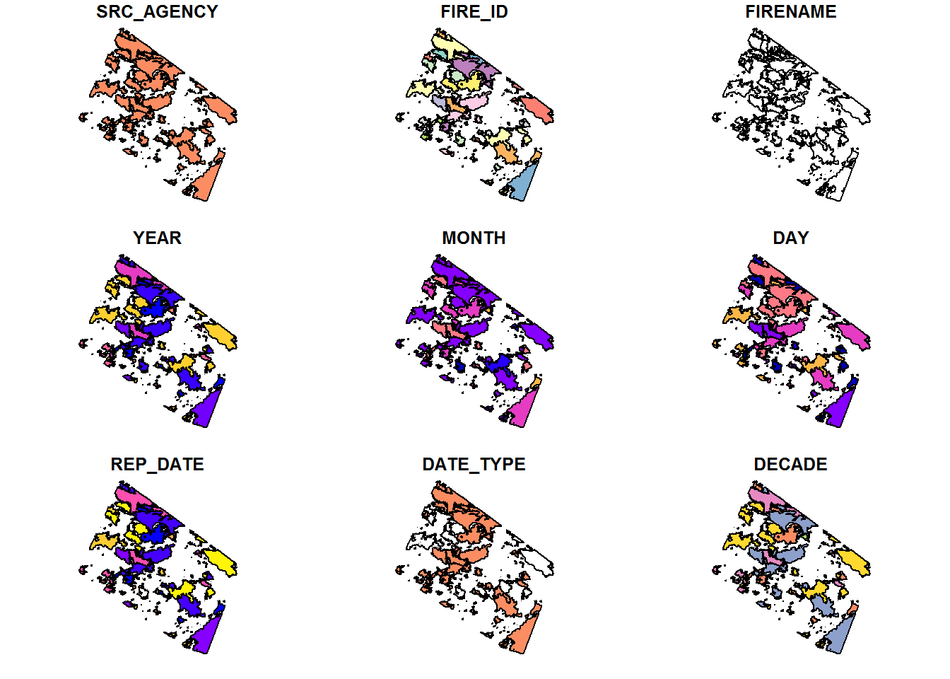 ## recentfire.raster <- rasterize(recentfire.sf, EOSD.blank, field = c("FIRE_ID", "YEAR", "REP_DATE", "OUTDATE"))