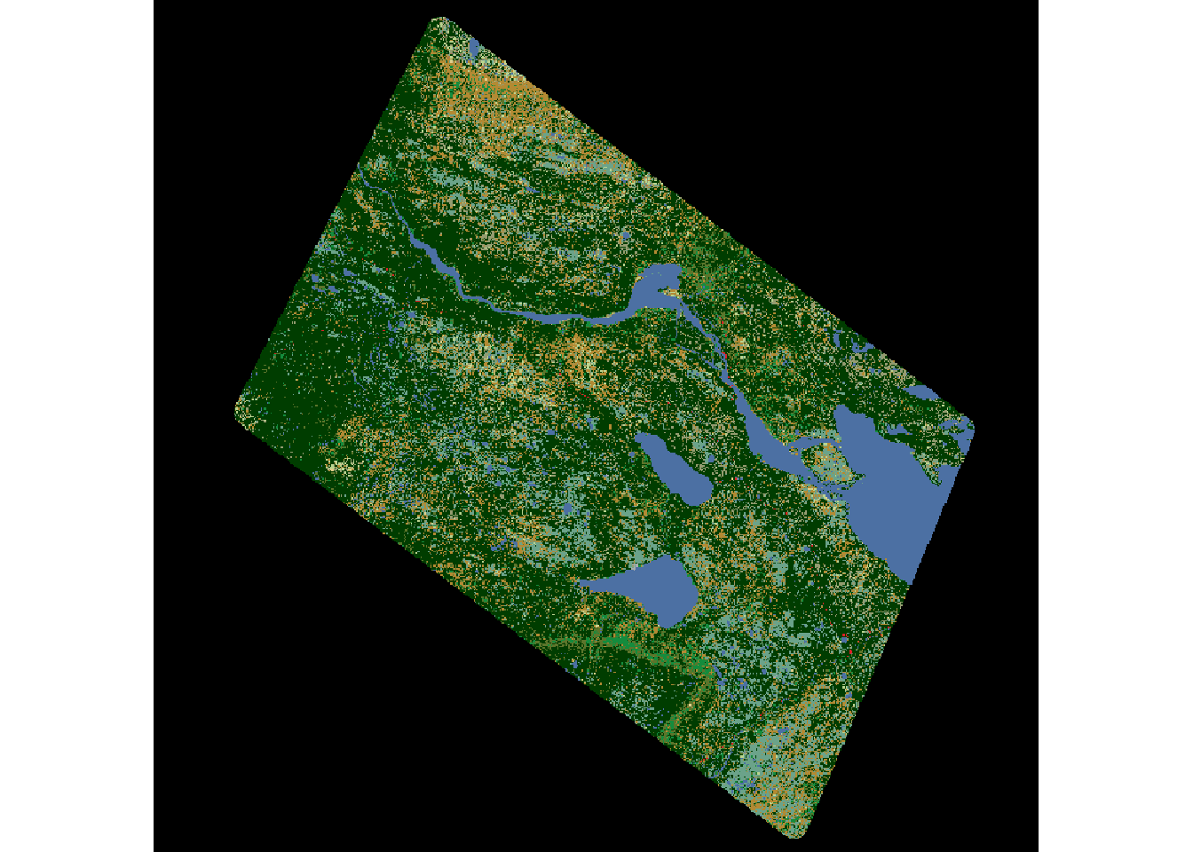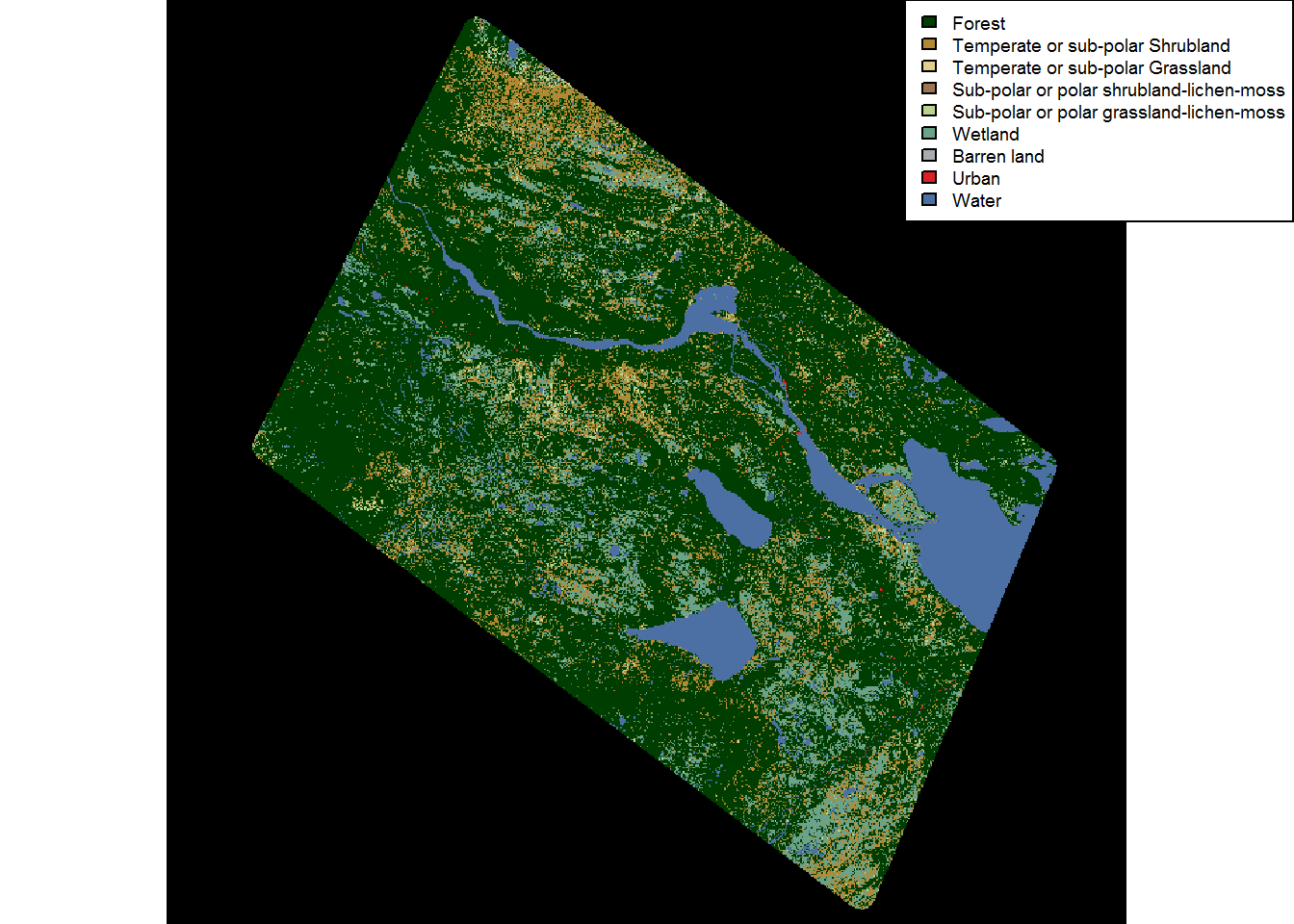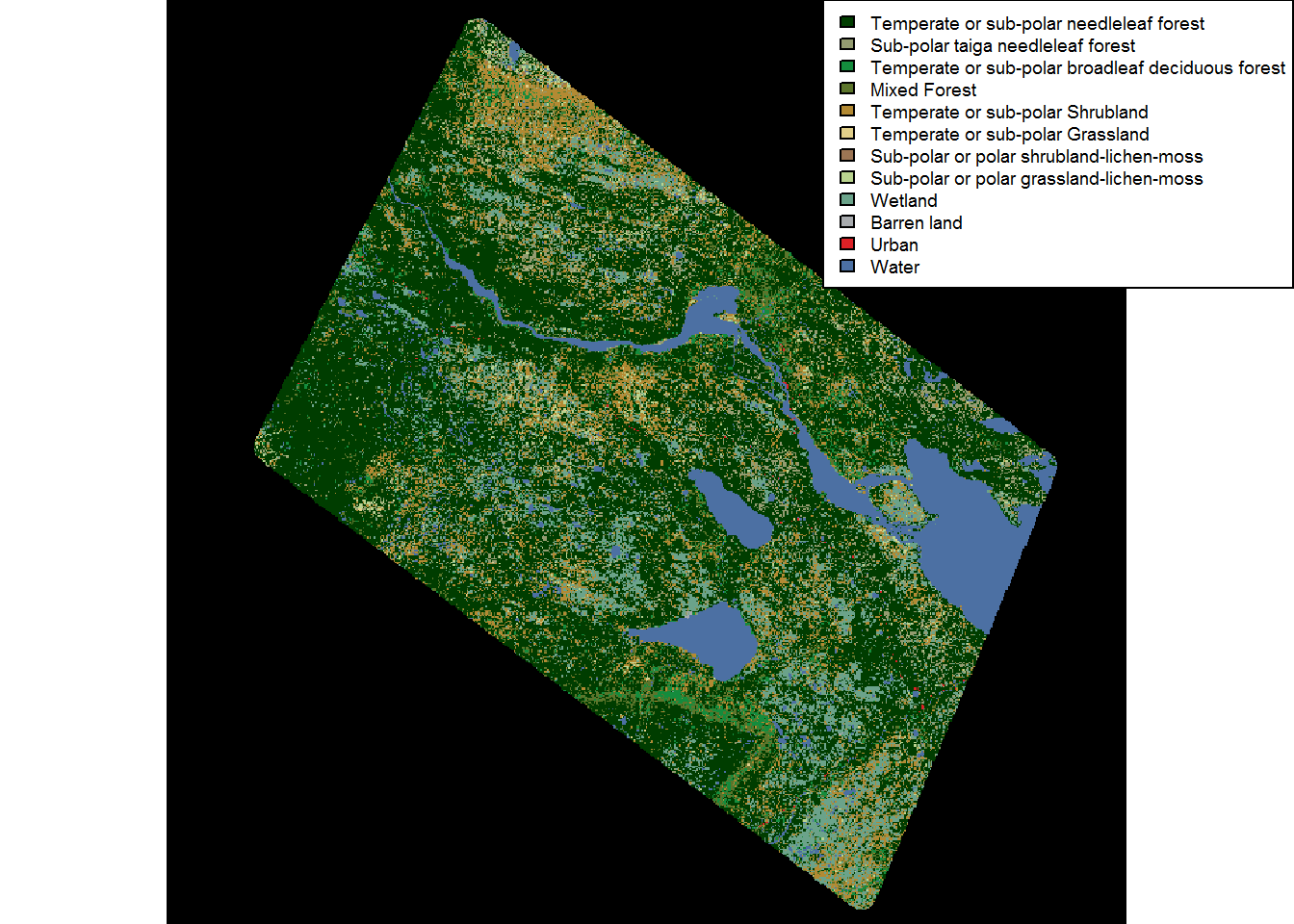 The land cover raster we are using is from the North American Land Cover Management System (NALCMS), a joint project between Canadian, US, and Mexican organizations. The project is a multi-scale land cover monitoring framework which can be applied across North America. This raster is of a small section of the Northwest Territories, Canada, on the western edge of Great Slave Lake.