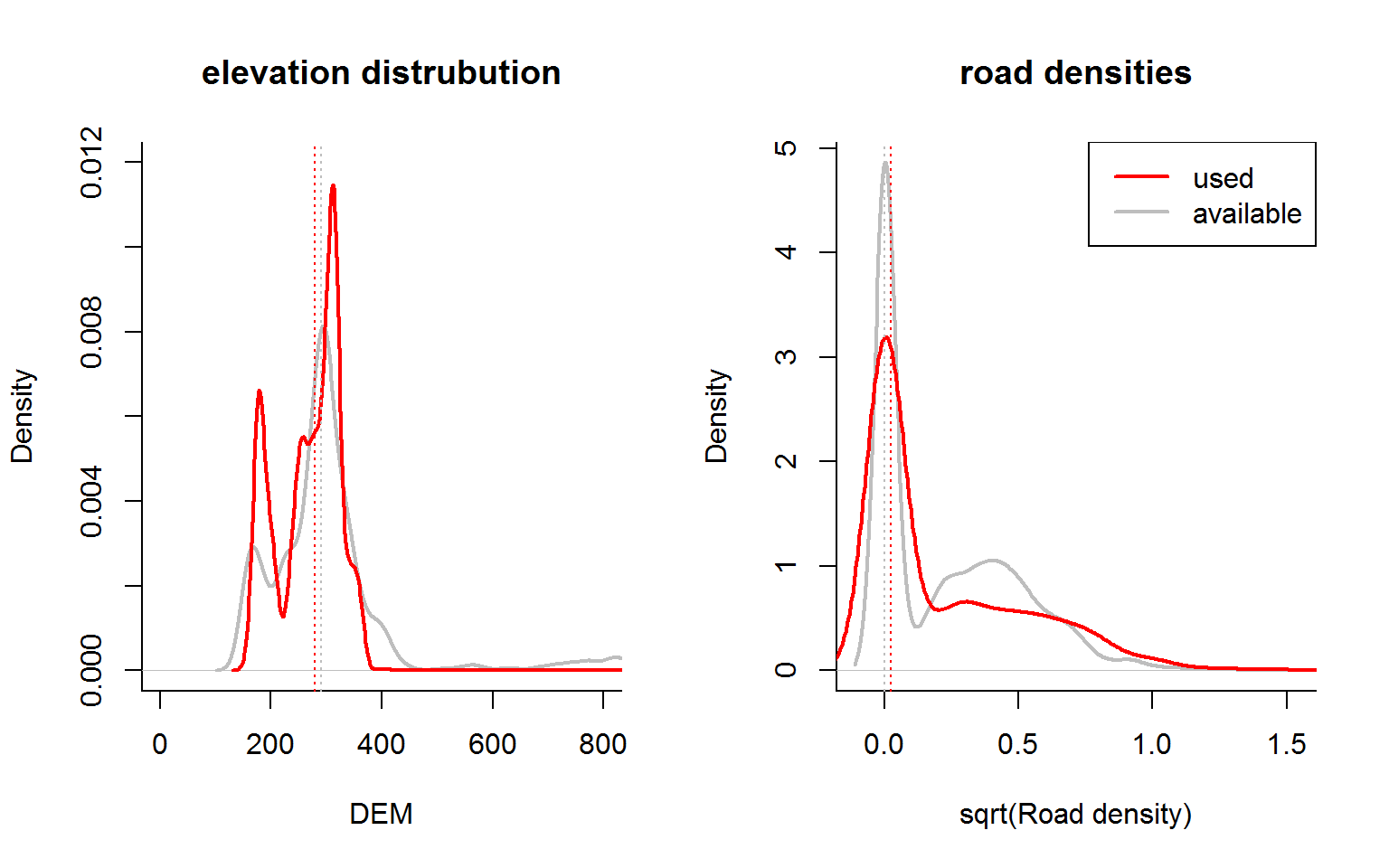 abline(v = tapply(DEM, Used, median), col = c("grey", "red"), lty = 3)