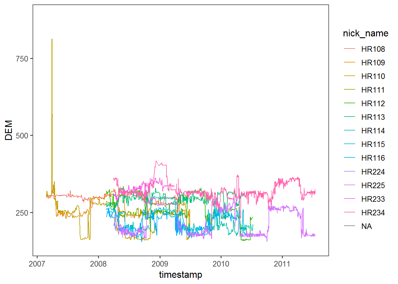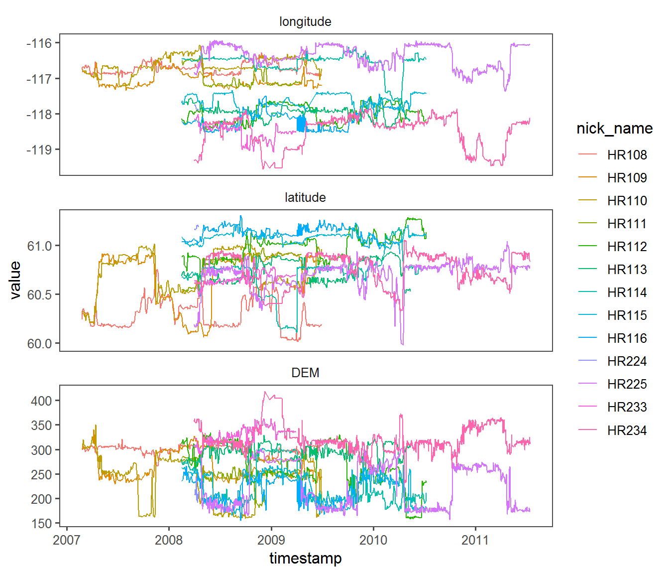 This is actually a super-interesting plot, since it indicates that quite a few animals have a strong seasonal range shift with some altitudinal site fidelity in the winter, but less so in the summer. It also shows exactly where one rather extreme altitudinal movement occurs near the beginning for HR110.