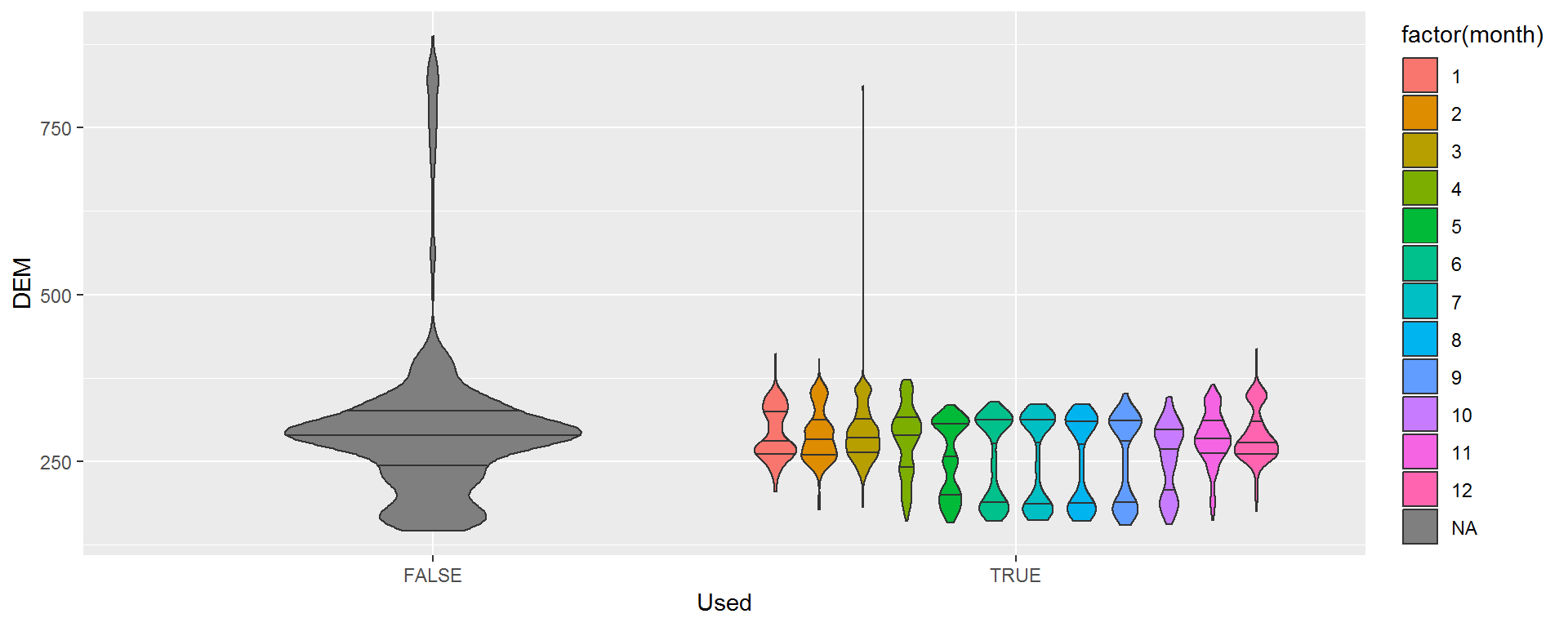 ggplot(hr, aes(Used, DEM, fill = factor(month))) + geom_violin(draw_quantiles = c(.25,.5,.75))