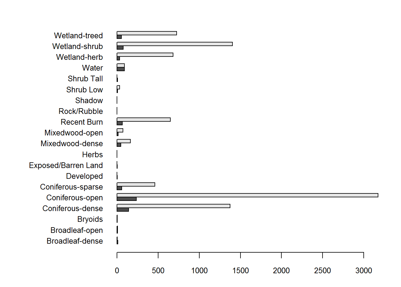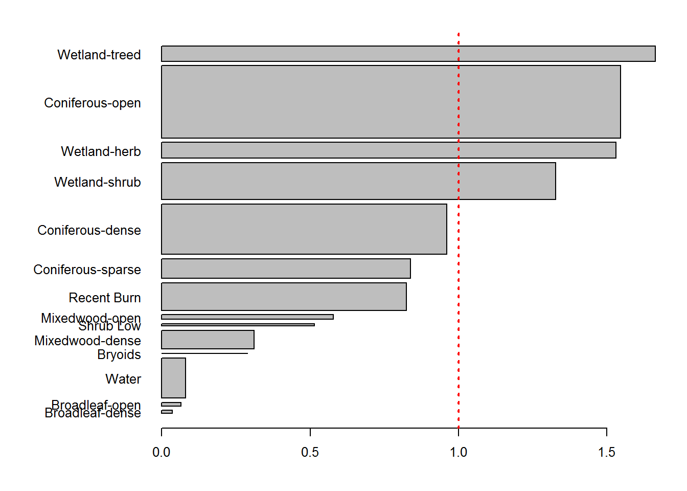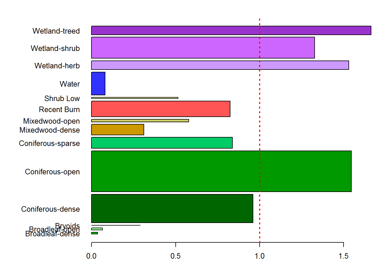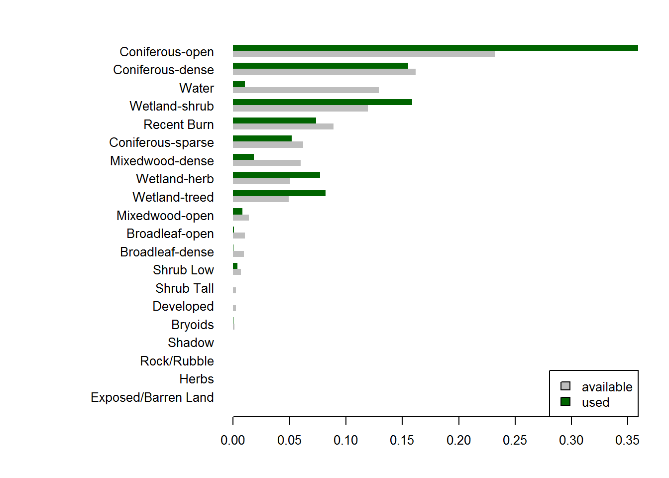 These are arranged by proportion of availability, and there are clear patterns to pick out, e.g. much higher than expected use of wetland herbs and wetland shrubs and, even, coniferous open habitat, avoidance of dense mixed woods and, most strongly but also obviously, of water.