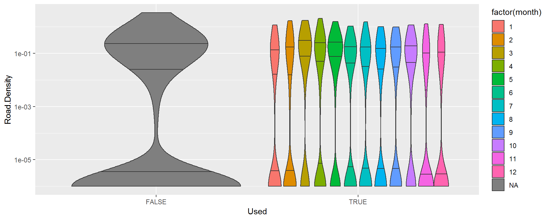 aes(Used, Road.Density, fill = factor(month))) + geom_violin(draw_quantiles = c(.25,.5,.75)) + scale_y_log10()