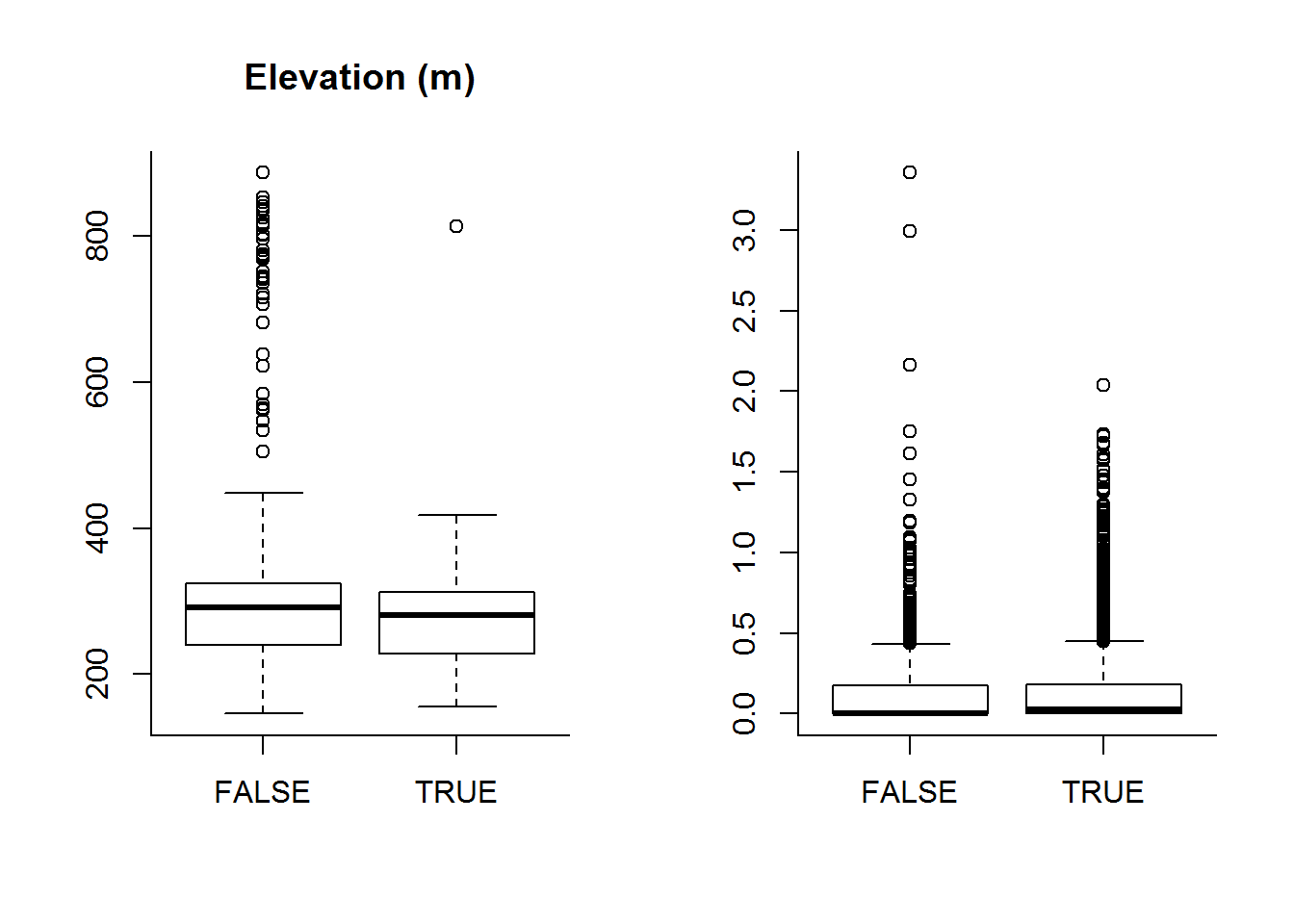 boxplot(DEM ~ Used, data = hr, main = "Elevation (m)")