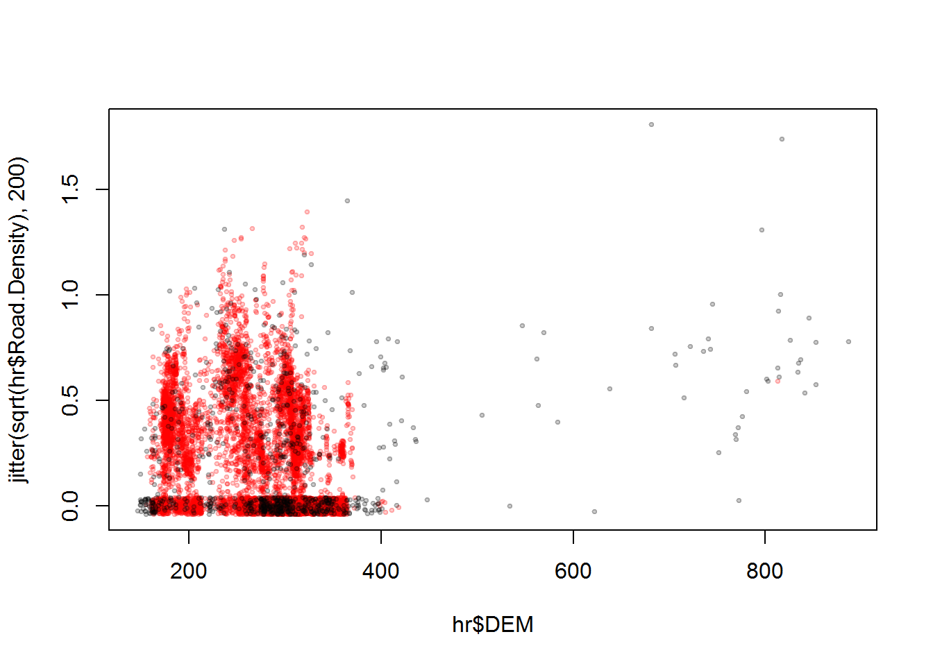 plot(hr$DEM, jitter(sqrt(hr$Road.Density), 200),