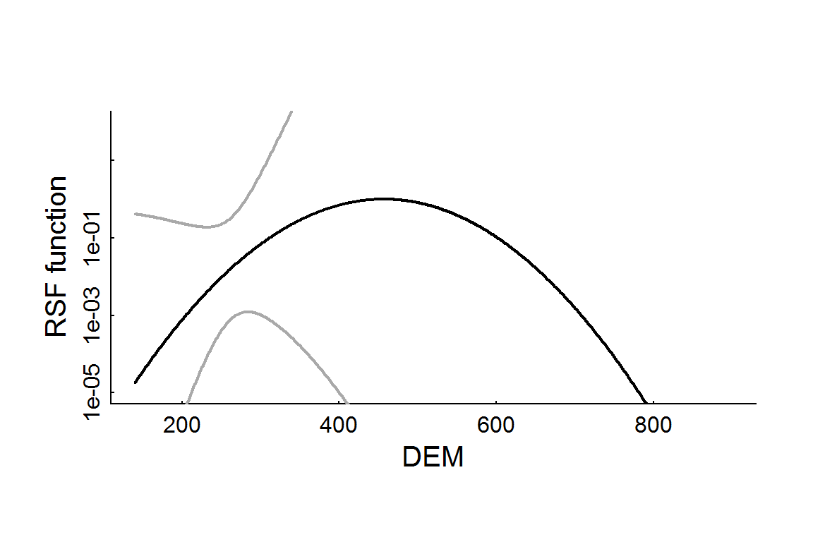 Note that that this plot is in the log-odds scale. According to this fitted model, the peak preferred elevation is DEM[which.max(RSF.prediction)] = 457 m. To obtain the RSF itself, you simply take the exponent (and - somehow - normalize), e.g:
