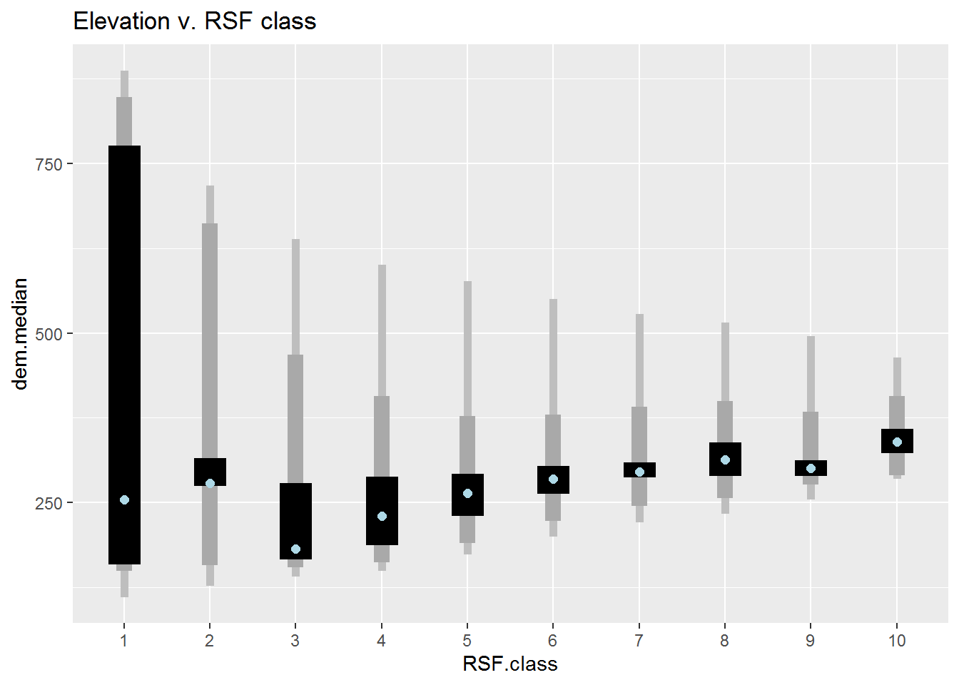geom_point(col = "lightblue", cex = 2) + ggtitle("Elevation v. RSF class")