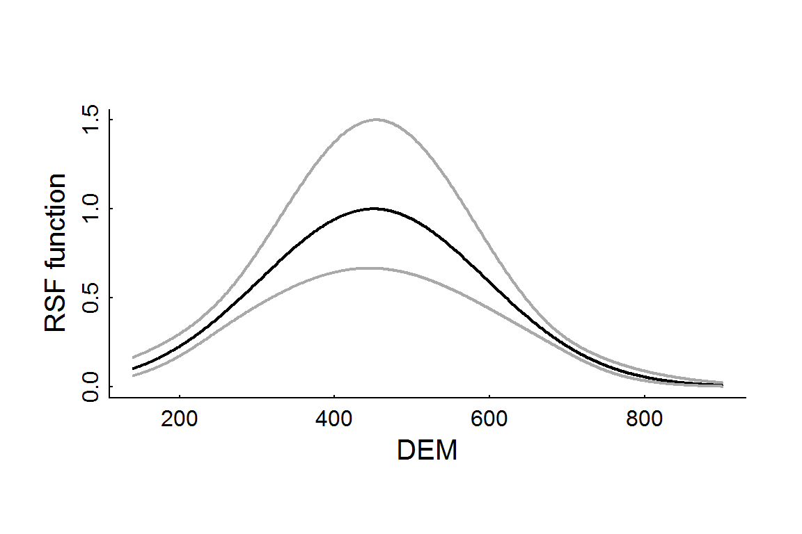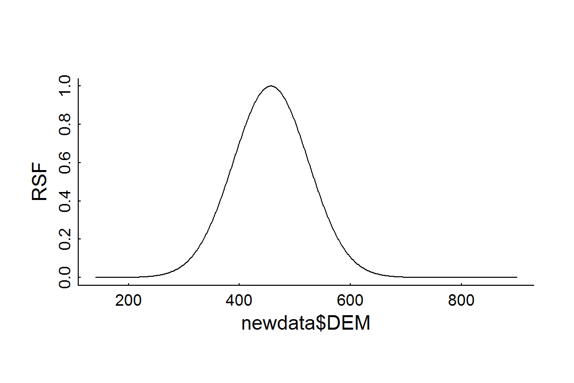RSF.prediction.df <- with(RSF.prediction.se, data.frame(DEM = newdata$DEM, rsf.hat = exp(fit)/max(exp(fit)),