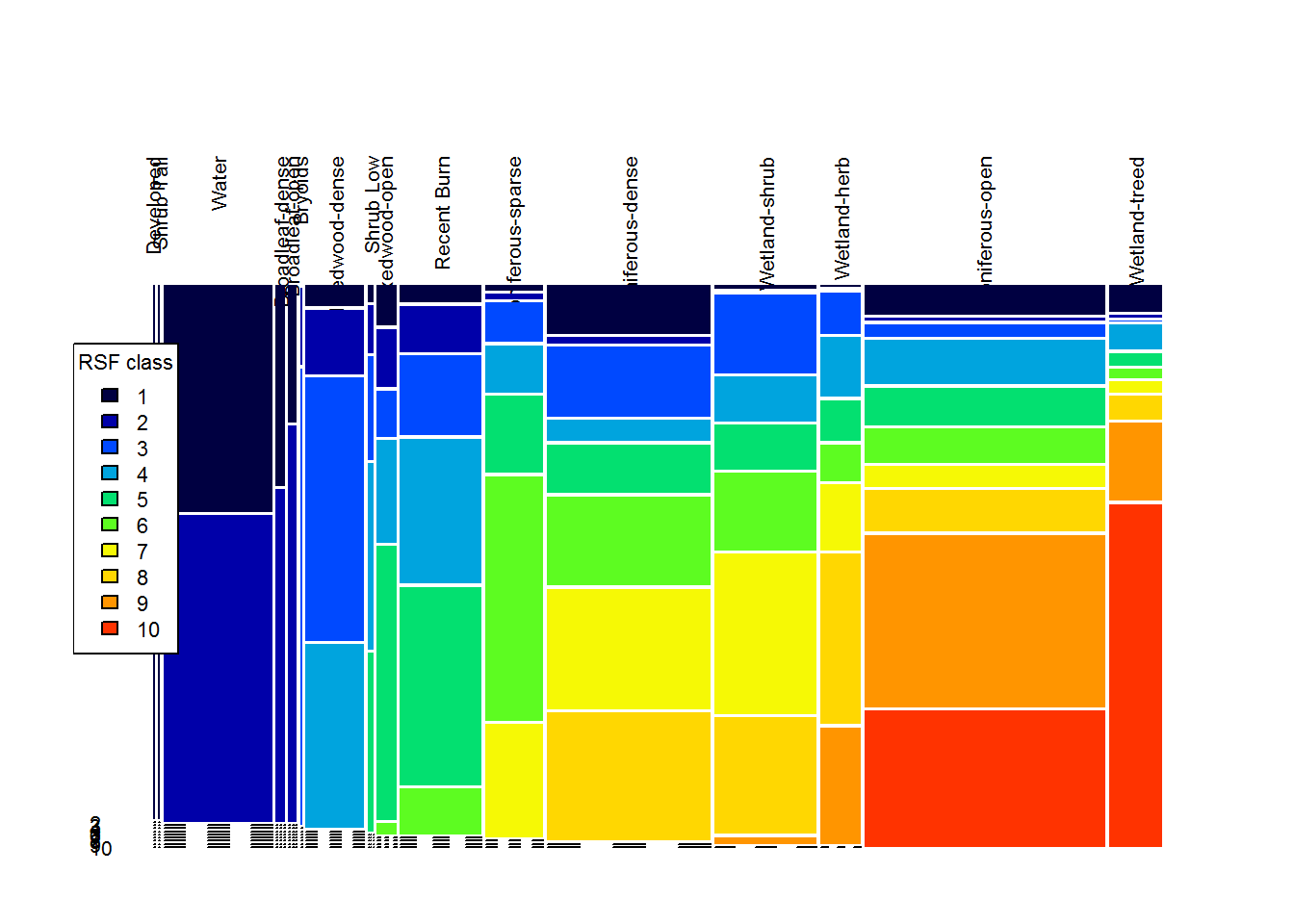 These plots are pretty informative. You can see, for example, that class 10 (the best habitat) is ENTIRELY in the Wetland-treed and Coniferous Open habitat, that the class 9 & 10 elevations are all between about 270-480 m, and that most of the higher road density locations are in the lowest reference classes.
