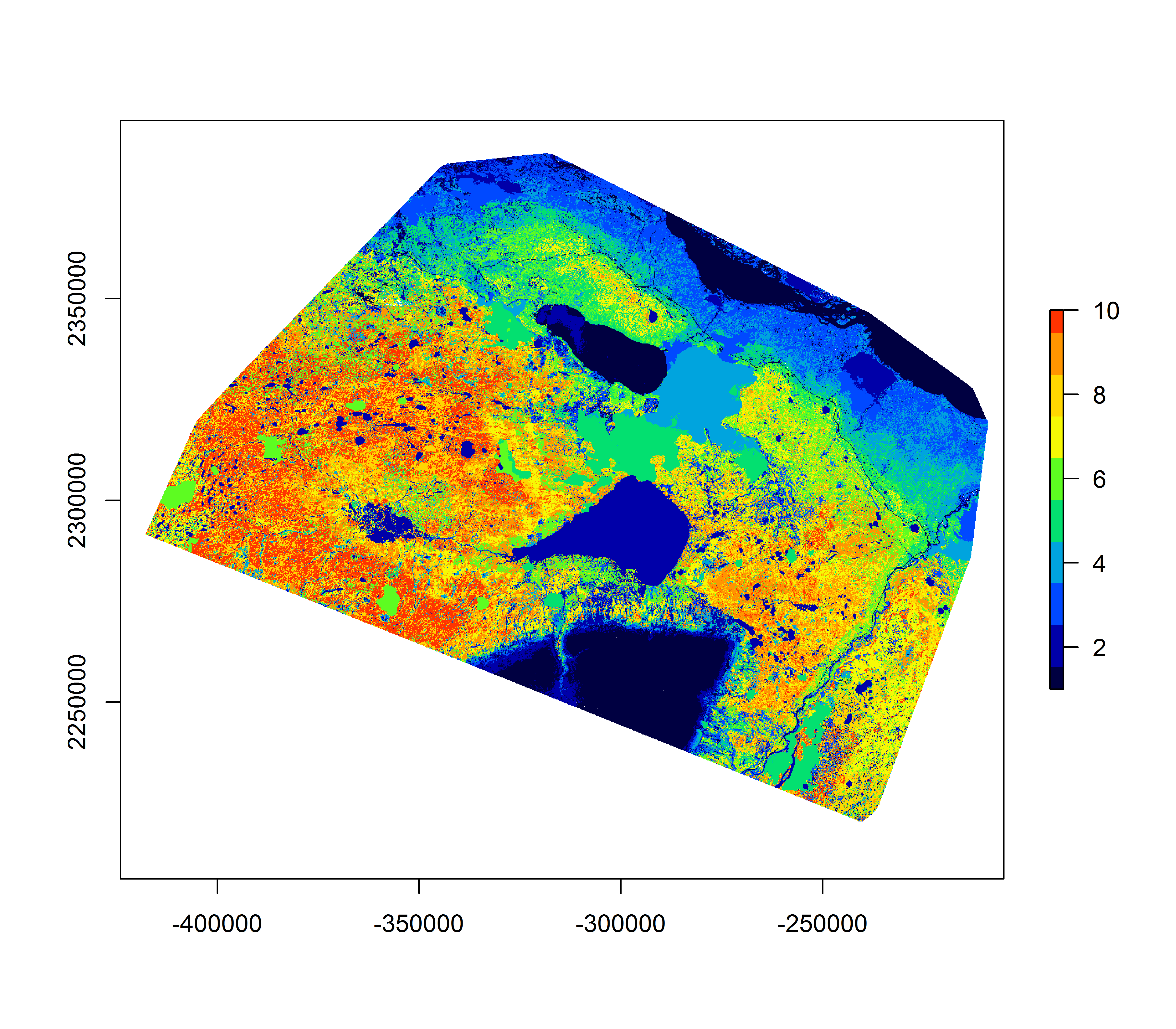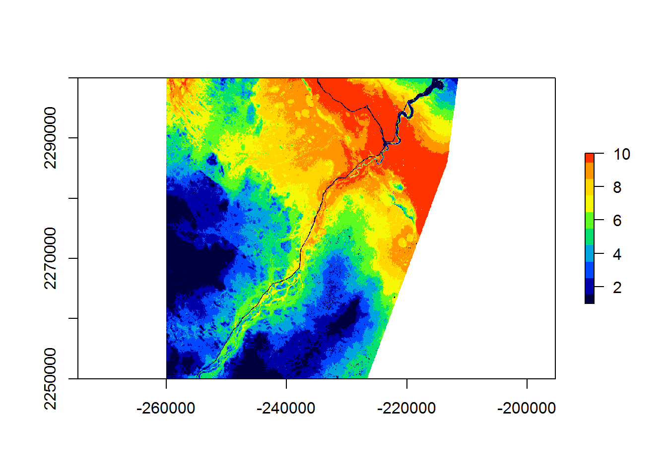 hayriver.RSF.discrete <- cut(hayriver.prediction, breaks = breaks, labels = 1:10)