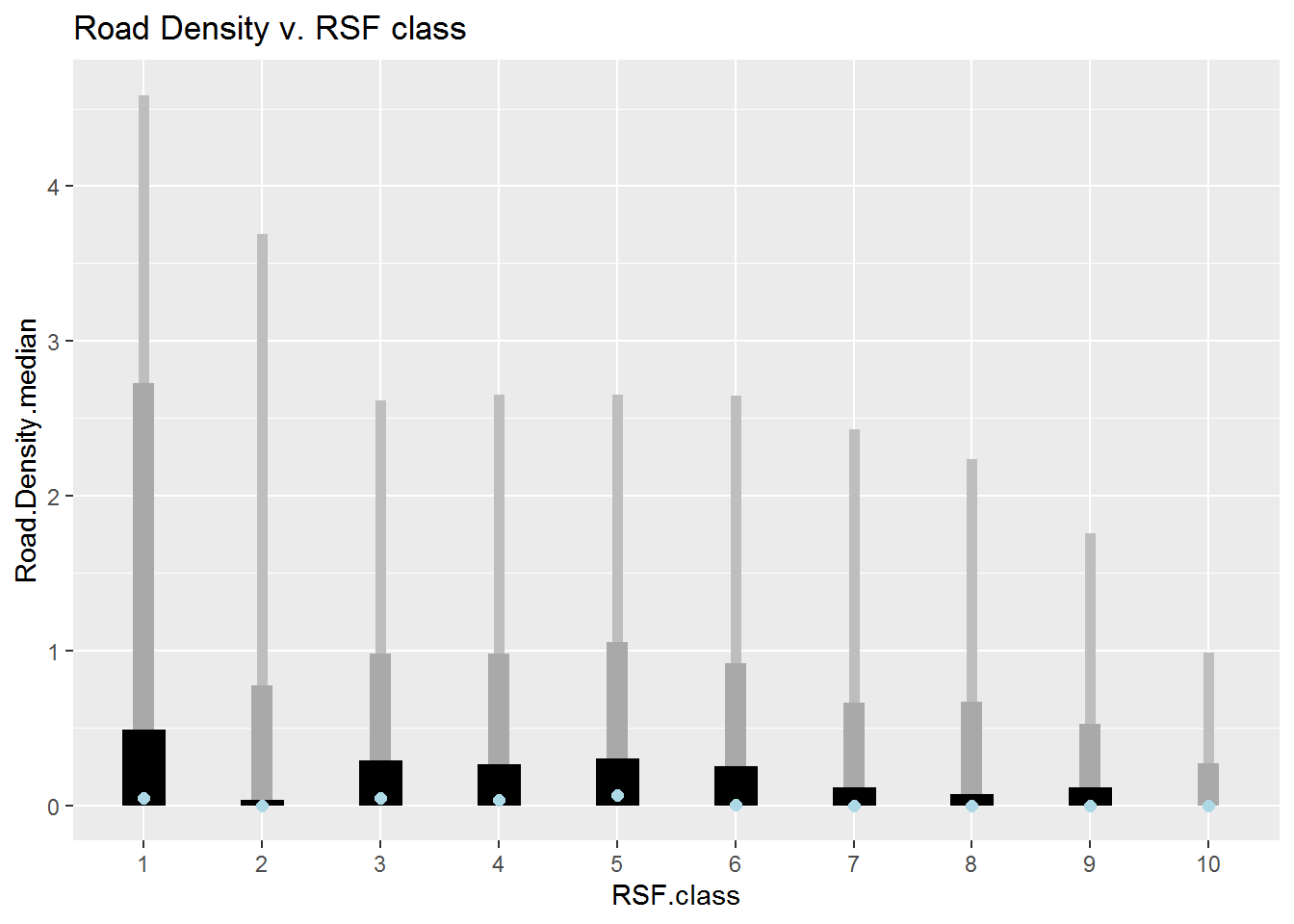 geom_point(col = "lightblue", cex = 2) + ggtitle("Road Density v. RSF class")