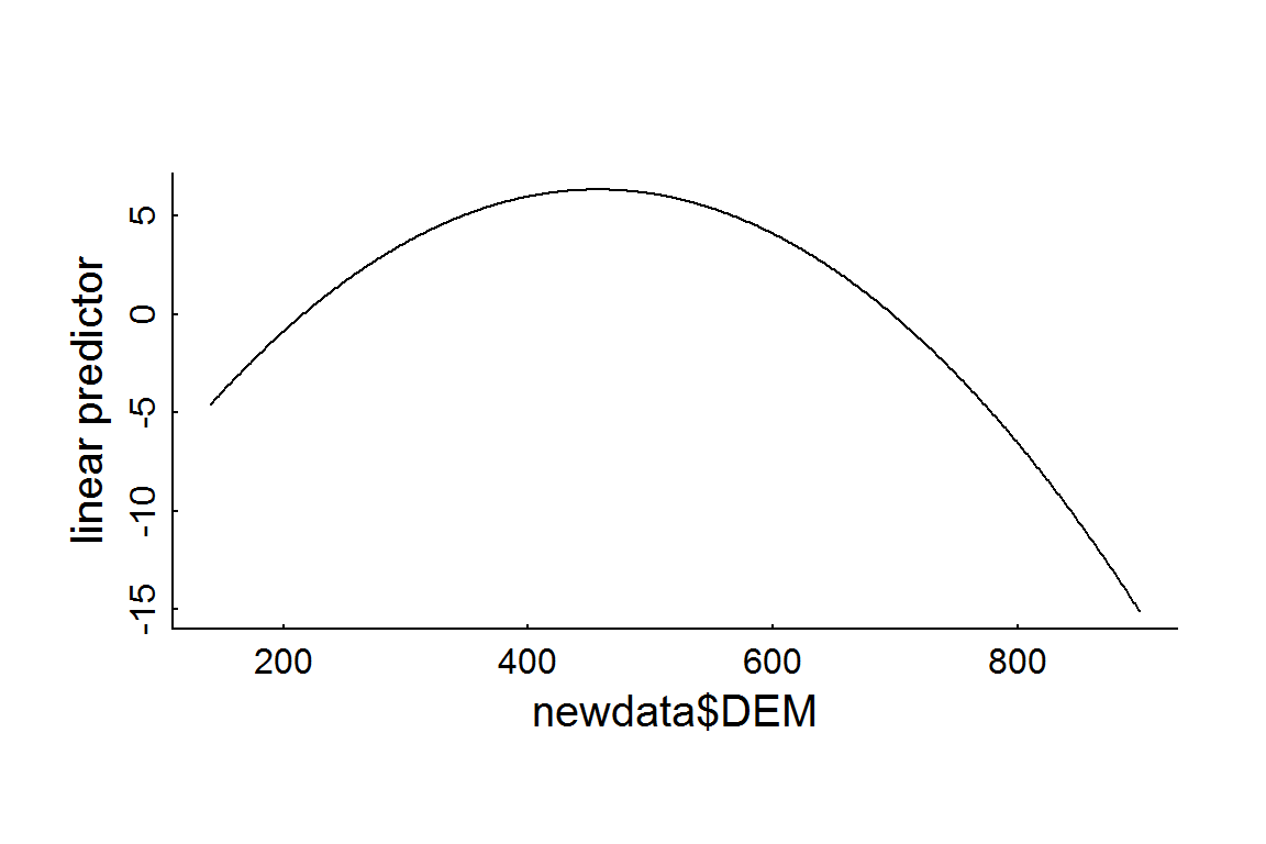 It is easy to generate predictions from this model (and any fitted model) using the predict function. By default, this function returns the linear predictor (i.e.: the sum \(\beta_0 + \beta_1 x_1 + \beta_2 x_2 + \beta_3 x_3 + ...\)). The requirement is to have new data formatted identically to the orignial data used to fit the model. For example, to see what the elevation preference profile might look like, you can create a dummy data frame in the open coniferous habitat type in areas with zero road densities. We set elevations that cover the range of available elevations (140-800 m):
