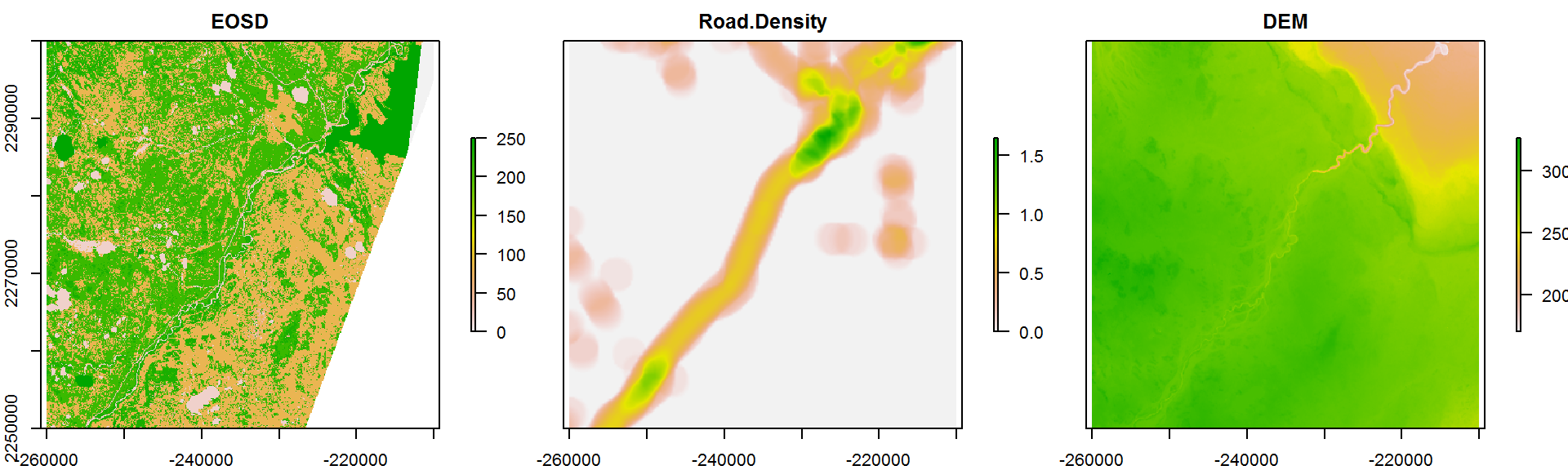names(Covar.brick) <- c("EOSD", "Road Density", "DEM")