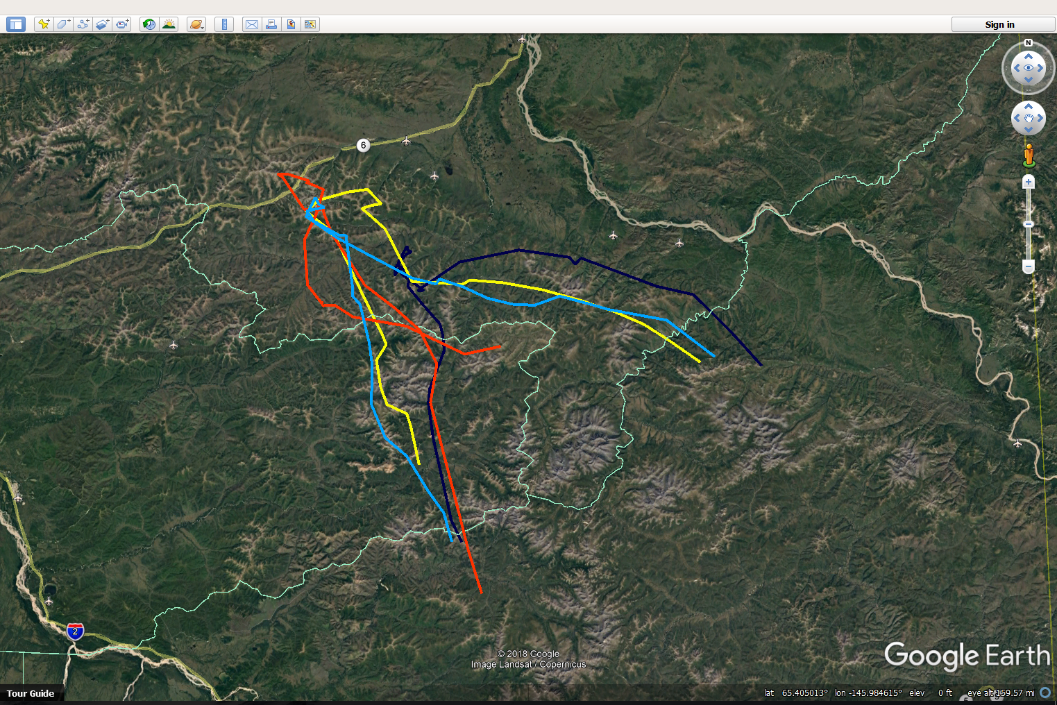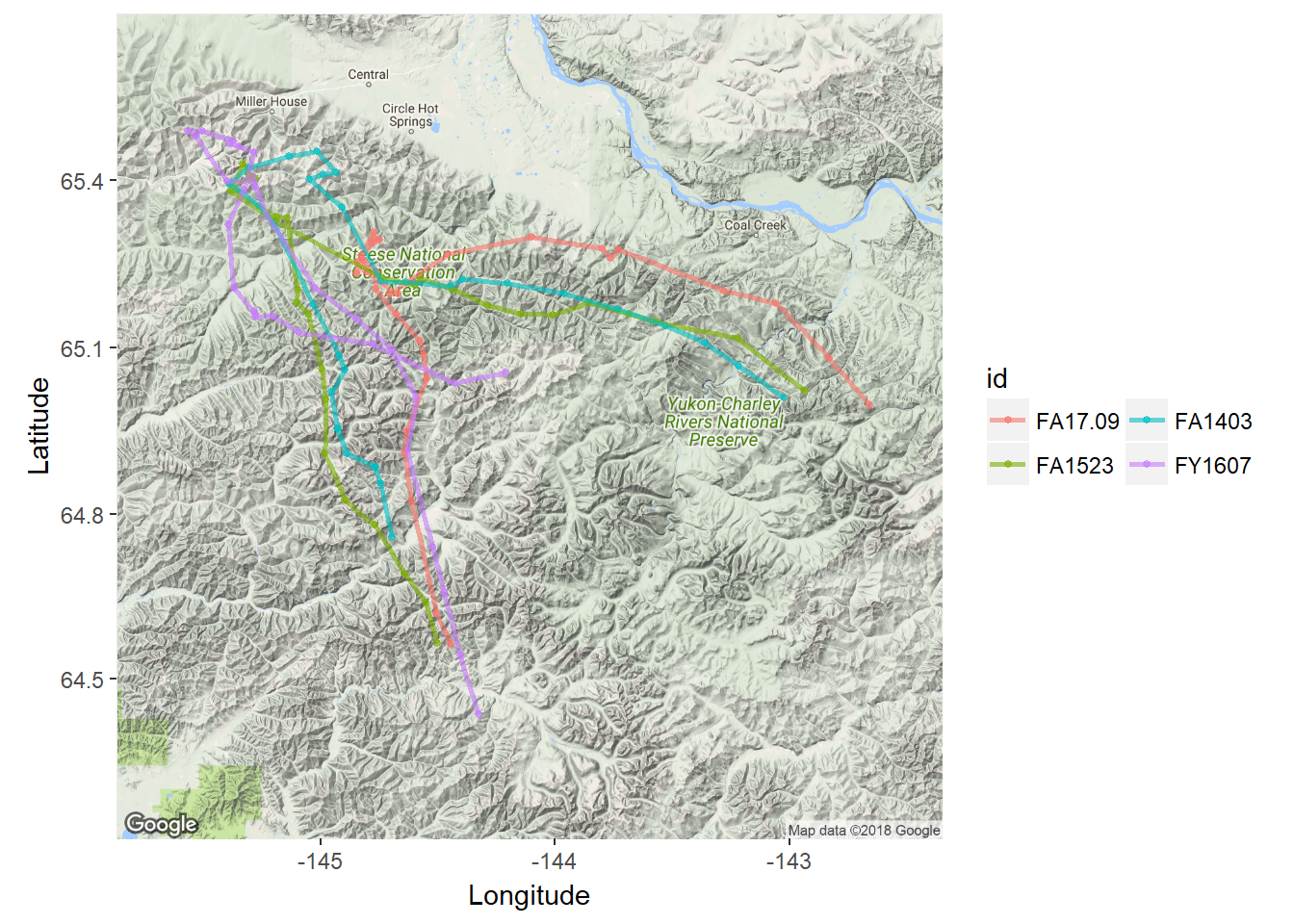 This will generate 4 files, one for each caribou, that can be opened in Google Earth. The biggest trick here is the awkward command for matching the colors col=match(myid, unique(caribou.daily.df$id))), which is saying: match the ID of each individual caribou to same ID in the list of IDs. This uses a favorite palette called rich.colors from gtools).