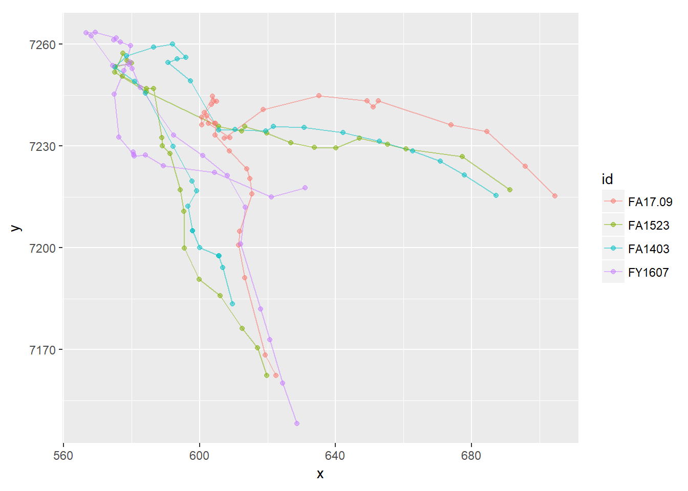ggplot(caribou.daily.df, aes(x=x, y=y, col=id)) + geom_path(alpha = 0.5) + geom_point(alpha = 0.5) + coord_fixed()