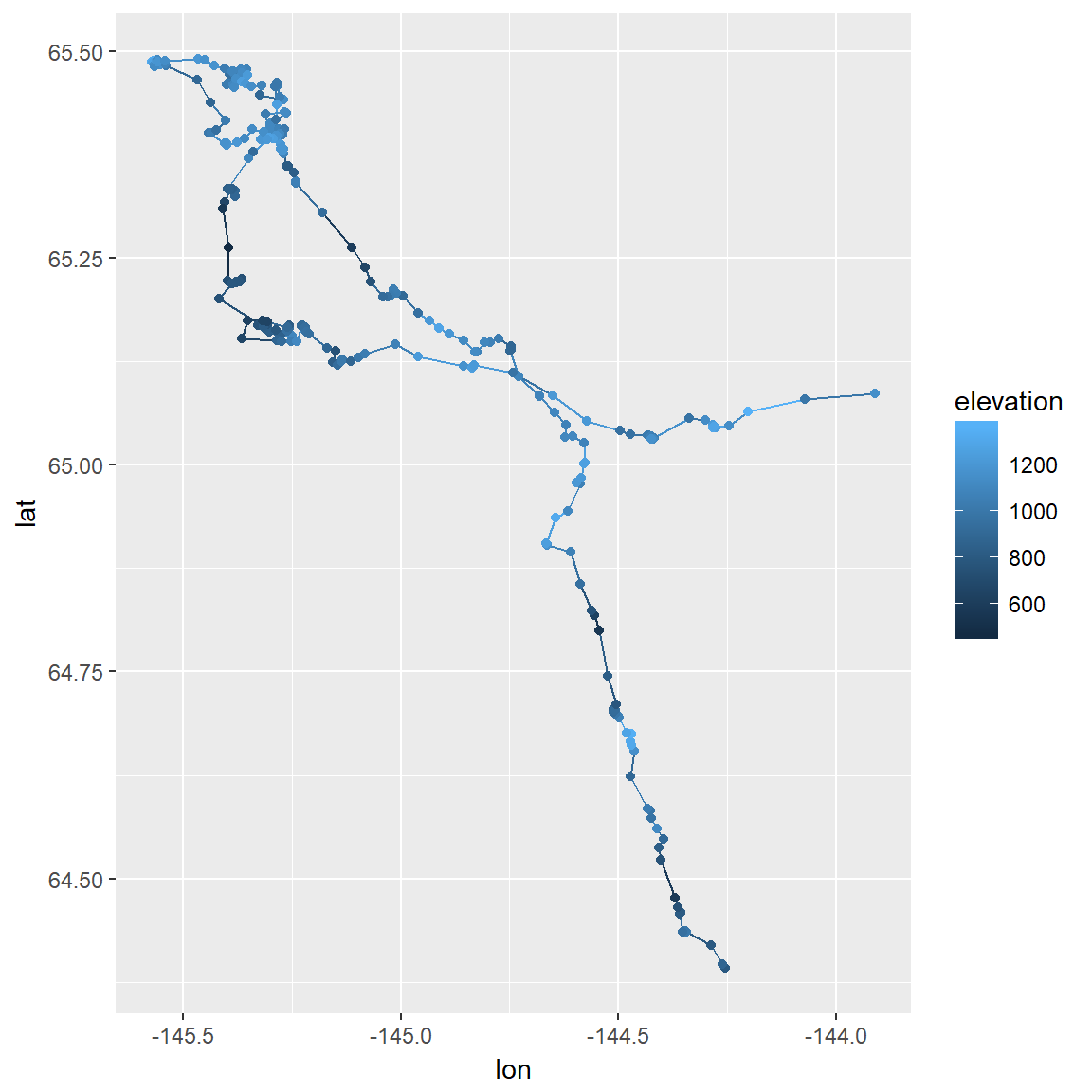 Often there are additional covariates (sometimes referred to as “annotations”) that can be added to a visualization. These caribou collars collect elevation data. ggplots are good at layering information. For these plots, we’ll load the caribou data with all locations, not just the daily mean locations. Below is a ggplot of one caribou with color reflecting elevation: