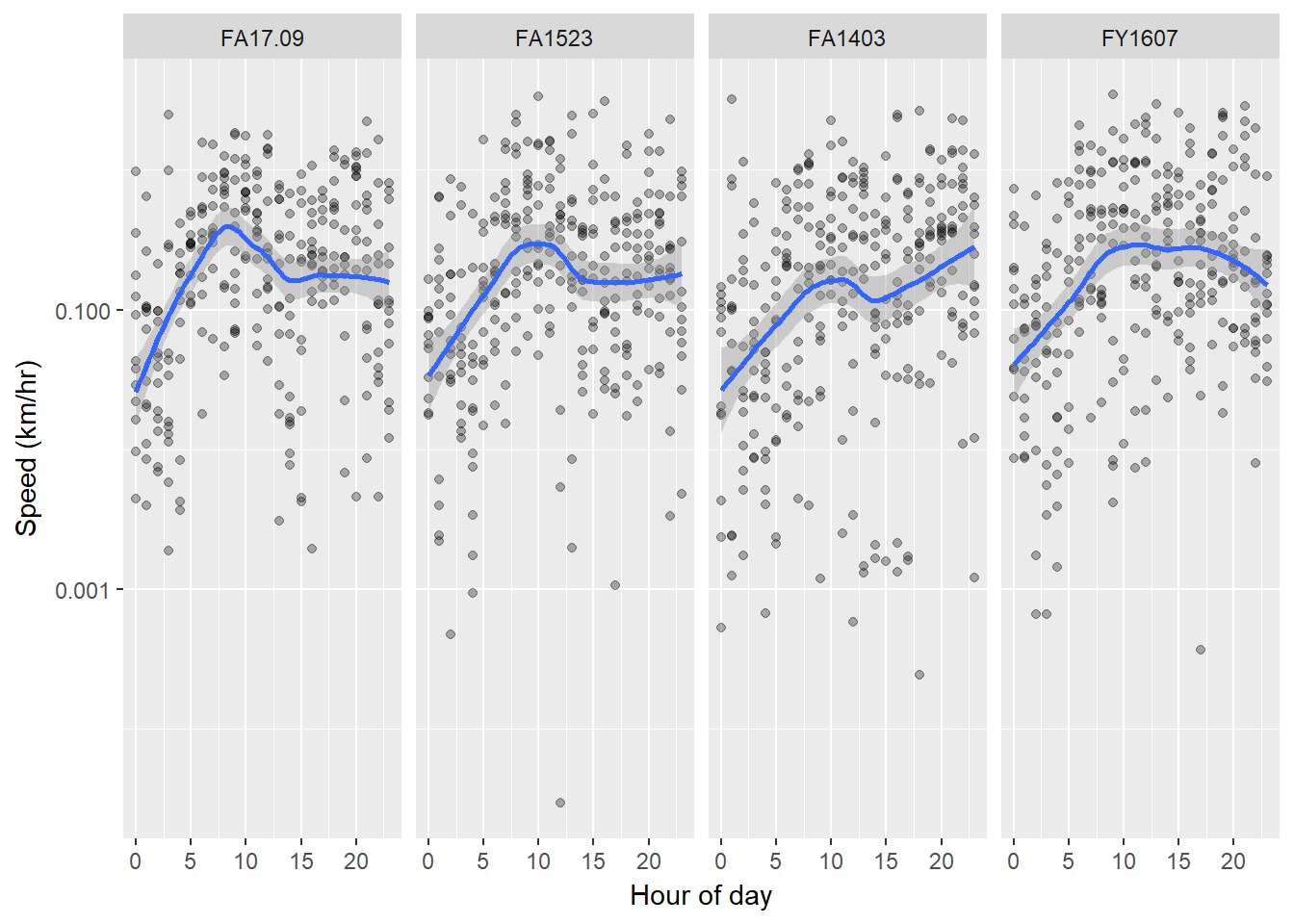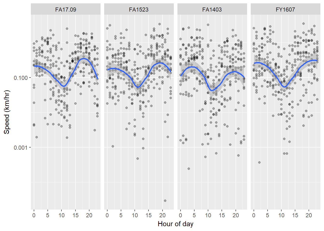 We could try to visualize this even better against hour of day across individuals with ggplot. Note: faceting allows us to compare individuals nicely, and the stat_smooth() feature draws a visual guide for the shifts. We’ll put speed on a log scale:
