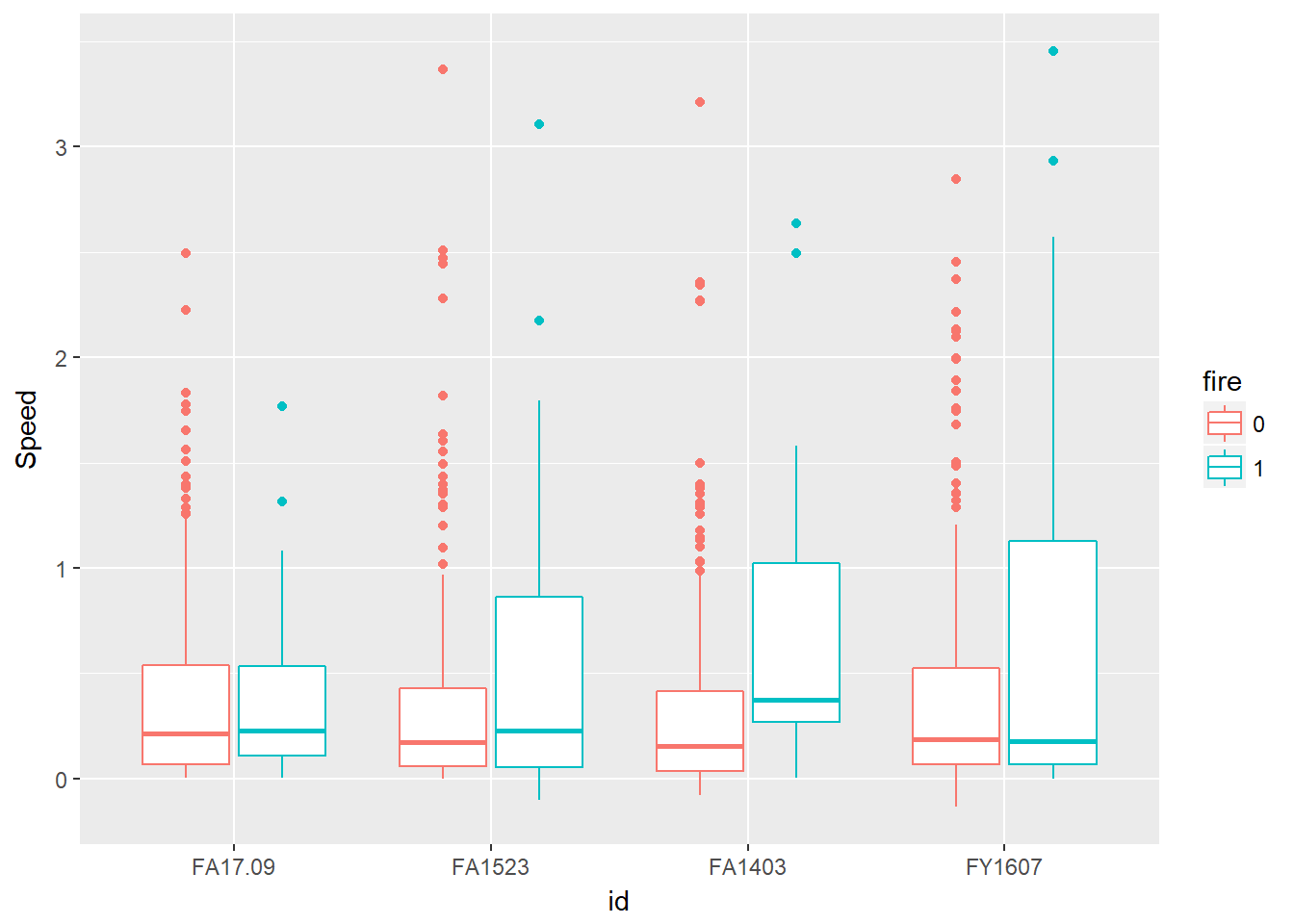 ggplot(caribou.sf, aes(id, Speed, col=fire)) +