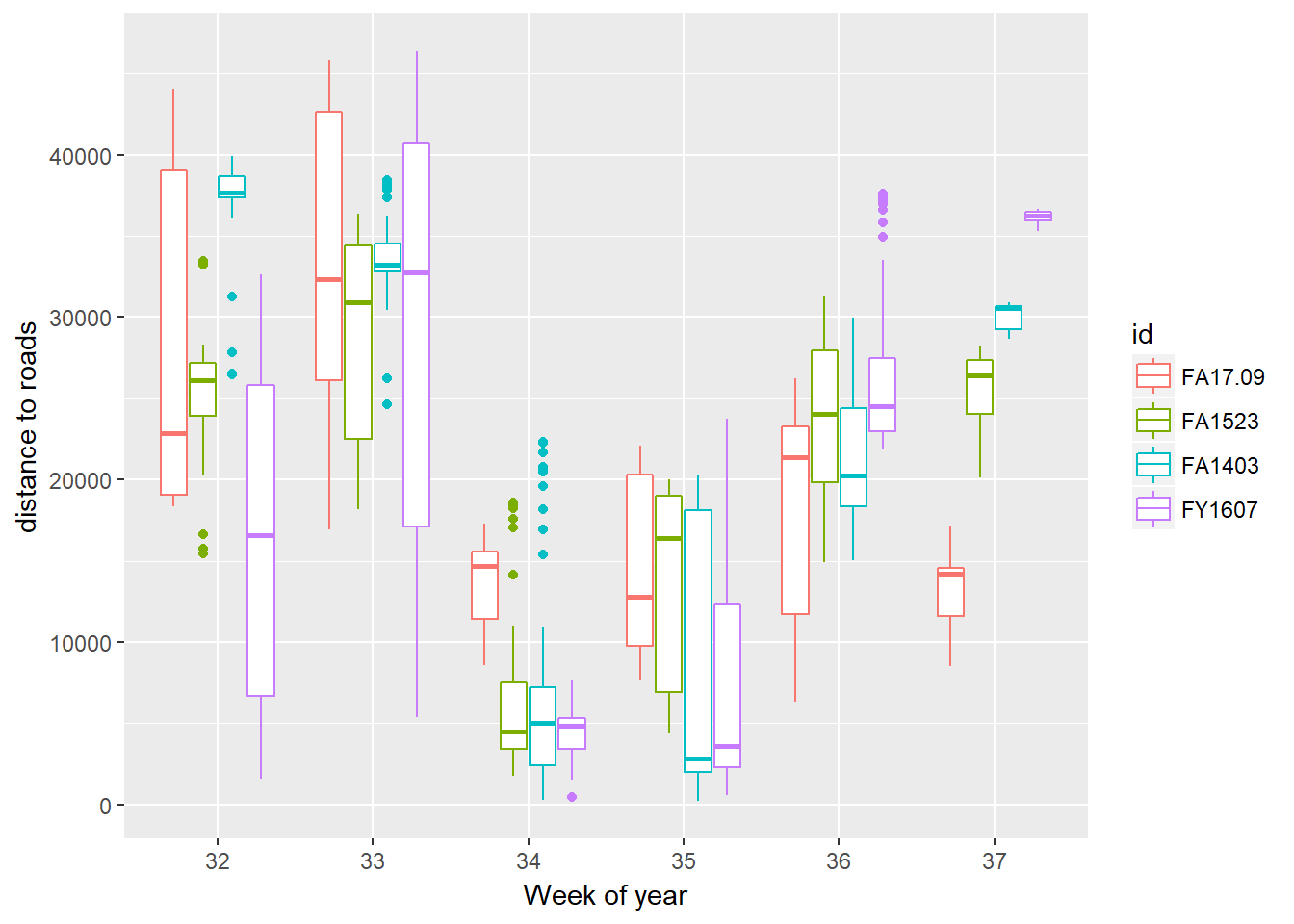 A boxplot of distance to road by week of year, colored by individual caribou: