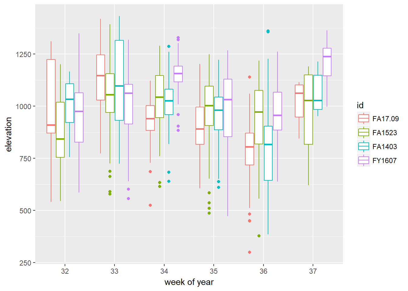 ggplot(caribou.df, aes(as.factor(week(time)), elevation, col=id)) +