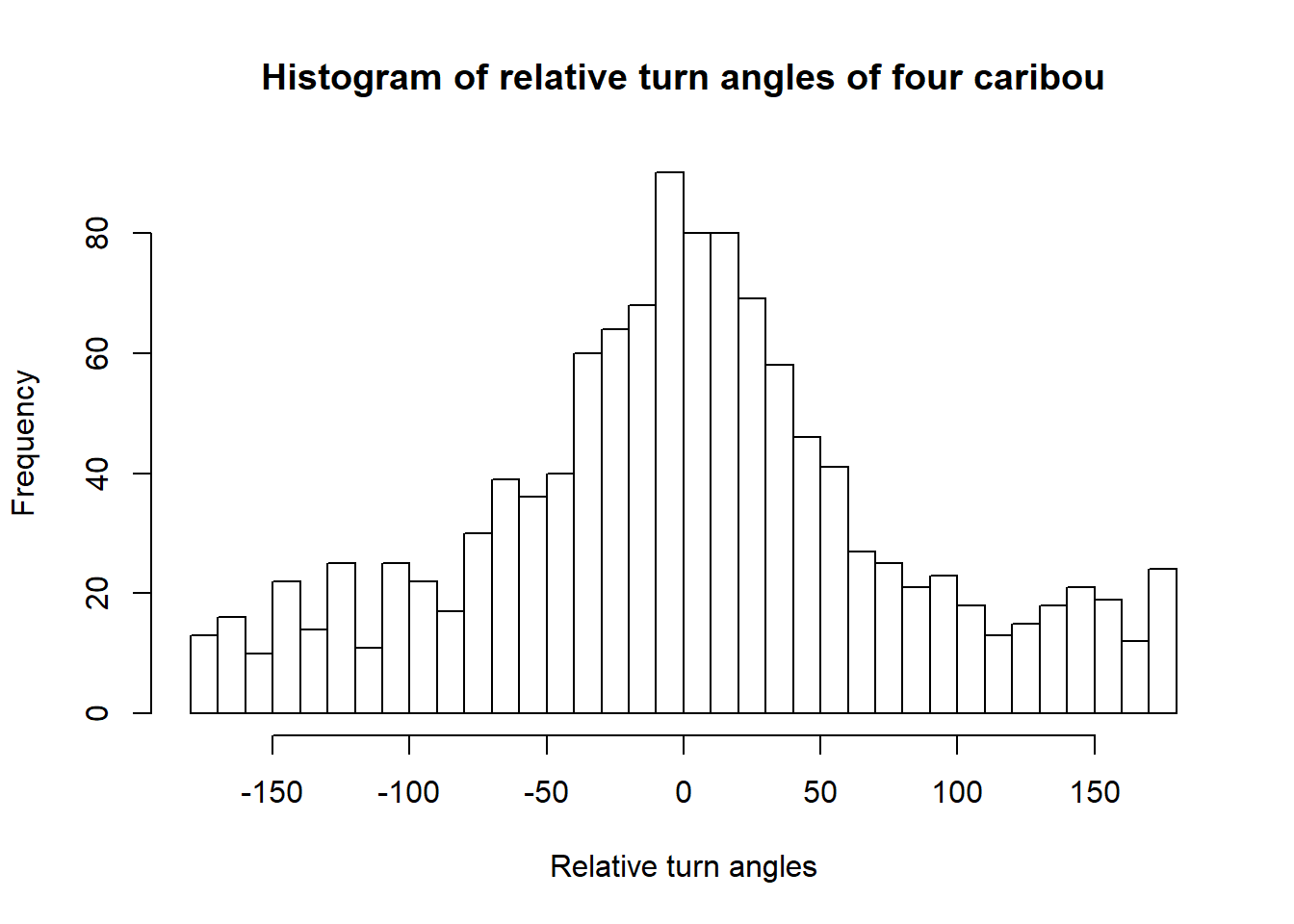hist(unlist(turn.angles.move), main="Histogram of relative turn angles of four caribou", xlab="Relative turn angles", breaks=40)